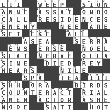 ACROSS 1. Cards in a Roman deck? 4. Shed a tear 8. The Jewish people; Israel 12. Singer Murray 14. Slender Brazilian palm 16. Southwest Nigerian state 17. Give a ring to 18. Homes 20. Foe 22. Born 23. "We ___ not amused" (Victoria) 24. Put into a specified state 25. Make supply last 28. 100% 30. Toward the sea 31. Spanish missionary in California 35. Followers of ems 37. Celtic language 40. Christmas carol 41. Narrow board 42. Impudent aggressiveness 44. Water jar 45. Trig term 46. Passed on 47. Marina Del _, California 48. Erodes 50. Mediterranean tributary 52. Health resort 54. Beverage made from leaves 55. One more than two 58. Quiet! 61. Mouth or opening 63. Avian creatures 65. Act in opposition 70. Monetary unit of Yemen 71. So be it 72. Thespian 73. American tennis player Robert 74. Connecting point 75. Suttee (variant) 76. Being at a high temperature DOWN 1. Shoestrings 2. Empty; void 3. An arm off of a larger body of water 4. Armed conflict 5. Compass dir. 6. Curvy letter 7. Ache 8. Boy, to dad 9. South American Indian 10. River in Europe 11. Olfactory organ 13. Shade tree 15. The main thing one is thinking about 19. Snakelike fish 21. Affirmative reply 26. Peachy ____! 27. Having ears or earlike features 29. Poe poem 30. Michaelmas daisies 32. Hero or heavy, e.g. 33. Have trust in 34. Chicken ___ king 35. Writer Wiesel 36. Grandmother 38. Indian title of respect (Mr.) 39. Incident 41. Compass dir. 43. Singer Brickell 49. Blemish 51. Experiment locale 53. Type of rug 55. From or relating to Ireland 56. Potato state 57. Small island 58. Skim 59. Same (prefix) 60. Became colored 62. Curves 64. Retirement account (abbr.) 66. Compass dir. 67. _ moment's notice (2 wds.) 68. Small bed 69. Three (prefix)