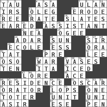 ACROSS 1. The 19th letter of the Greek alphabet 4. White ___ sheet 7. ____ Bator, Mongolia 11. Big collection agency 12. Cassini of fashion 13. Wear away 14. To riddle 15. Pace 16. Chalkboards 17. Having ears or earlike features 19. Aide 21. Teachers' org. 23. Double curve, resembling the letter S 24. The sixth month of the Jewish calendar 25. Player for Phoenix 26. Title for a knight 29. Learning spot: Fr. 30. Curvy letter 31. Mouth or opening 32. Make lace 33. Before (prefix) 34. Area sheltered from the wind 35. Bear (Spanish) 36. Armed conflict 37. Flower holders 40. Nine, plus one 41. Call ___ day 42. On the rocks 43. Old wives' tales, e.g. 45. Adept person 46. Home 51. Witty Wilde 55. Speaker 56. Chops off 58. Single 59. Carrier 60. A single undivided whole 61. Single; one (prefix) 62. SW Saudi Arabia district 63. Compass dir. 64. Animal enclosure DOWN 1. Hoop that covers a wheel 2. Type of rug 3. One who makes use of a thing 4. Chicken ___ king 5. Bristle 6. Matures 7. A salt of uric acid 8. Globular water bottle used in Asia 9. An important port of Yemen 10. Egg locale 12. Severe or trying experience 13. Otherwise 16. Public displays of written messages 18. Inside; within (prefix) 20. Lush 22. "We ___ not amused" (Victoria) 24. 13-14th century defensive garment 25. Father Junipero _ 26. Having a sole or soles 27. Angers 28. Actress Charlotte 29. Comfort 32. Small child 33. Eucharist need 36. One who wires 37. By way of 38. Buttonhole 39. Perceives with the eye 43. 61 cubic inches 44. Aroma 46. Roll call or roster of names 47. Greek god of love 48. Suttee (variant) 49. A slight indication 50. Immeasurably long periods of time 52. Overturn; upset 53. Queen of England 1702-14 54. It's straight from the horse's mouth 57. Sliced dessert