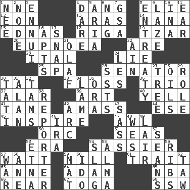 ACROSS 1. Compass dir. 4. Mild oath, euphamism for damn 8. Writer Wiesel 12. A really long time 13. Caspian sea tributary 14. Grandmother 15. Ferber et al. 18. Capital of Latvia 19. Russian ruler 20. Normal relaxed breathing 22. "We ___ not amused" (Victoria) 23. Slanted text style (abbr.) 24. Whopper 25. Health resort 26. Legislator 30. Make lace 33. Soft thread for cleaning between teeth 36. Musical group of three 37. Having or resembling wings 39. Nonscientific branch of learning 40. Shout 41. Docile 42. Collect or gather 44. Compass dir. 45. Motivate 47. Leather borer 50. The grampus (Milton) 51. Oceans 53. Epoch 54. More lively and spirited 57. Electrical Unit 59. Place where flour is made 61. Distinguishing feature 63. Singer Murray 64. First of billions? 65. Basketball assoc. 66. Posterior 67. Ancient Roman robe 68. Compass dir. DOWN 1. Born 2. Connecting point 3. World-weariness 4. Have the gumption 5. Roberta Peters solo 6. Tired old horse 7. Girls' org. (abbr.) 8. Plea 9. Goldbrick 10. _ tizzy (2 wds.) 11. Hearing organ 16. Tenement units (abbr.) 17. Fastener 21. Norwegian king 22. The 18th letter of the Arabic alphabet 24. French article 26. Fast planes 27. Family _ (genealogy) 28. Petroleums 29. Hero or heavy, e.g. 30. Jacques of French films 31. ____ Jay Lerner 32. Scottish caps 34. Unable to walk 35. Mouth or opening 38. News announcer 42. Curve 43. Backtalk 46. Lyricist Gershwin 48. Compass direction 49. Den 52. Actors Connery and Penn 53. Inactive volcano in Sicily 54. Volcanic refuse 55. _ mater 56. Teases 57. Armed conflict 58. One (Scot) 59. Floor protector 60. Wedding promise 62. The 23rd letter of the Hebrew alphabet