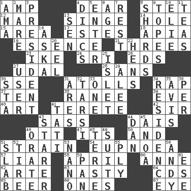 ACROSS 1. Electrical Unit 4. Letter starter 8. Proofreading order 12. Make imperfect 13. Burn superficially 14. Hollow 15. Type of rug 17. _____ Park, CO 18. Capital of Western Samoa 19. Substance 21. Triplets 23. D.D.E's nickname 24. Indian title of respect (Mr.) 26. Begley and Asner 27. Hereditary estate 28. Without 30. Compass dir. 31. Ringlike coral islands and reefs 34. Strike 37. "___ Little Indians" 38. The wife of a rajah (variant) 39. First lady 40. Tate display 41. Cylindrical with tapered ends 42. Title for a knight 43. Backtalk 44. Raised platform 46. Baseball player Mel 47. ___ a Wonderful Life 50. Plus 51. Put through a sieve 54. Normal relaxed breathing 57. One who doesn't tell the truth 58. Showery time 60. Queen of England 1702-14 62. Johnson of "Laugh-In" 63. Thoroughly unpleasant 64. Music discs 65. Fermented drink made from hops 66. Singles 67. Sight organ DOWN 1. Nanny (var.) 2. Female horse 3. Elected leader of a country 4. Flat circles 5. Keyboard key 6. Mature 7. Remainder 8. Broken pieces 9. Drinks excessively 10. Writer Wiesel 11. Afternoon social gatherings 13. Elected rep. 16. "____ silly question..." 20. Snakelike fish 22. Coop moms 25. Small island 27. One who makes use of a thing 29. Toward shelter 30. R.R. building 31. Ancient Greek god of war 32. Tarsus (plural) 33. Single 34. Dwelling 35. Deliberation 36. For each 41. Jacques of French films 43. A viewer who gazes fixedly 44. Daniel's nick name 45. Small Philippine buffalo 46. Speak pompously 48. Laconic 49. Sets of matching outer garments 51. Broad, flat, thick piece 52. Hoop that covers a wheel 53. Billionth: prefix 55. Strand of rope, yarn or thread 56. Actor Griffith 59. Baking dish 61. Compass dir.