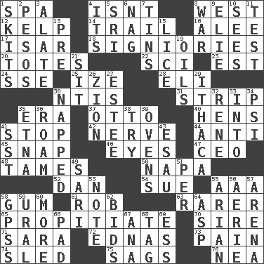 ACROSS 1. Health resort 4. Is not 8. 270 degrees 12. Seaweed 14. Go after with the intent to catch 16. Toward shelter 17. Austrian river, tributary to the Danube 18. Seigniories (variant) 20. Lugs 22. _-fi 23. Eastern Standard Time (abbr.) 24. Compass dir. 25. Ending with capital 28. Biblical high priest 30. Nuclear Threat Initiatives 31. Empty completely 35. Epoch 37. "Beetle Bailey" pooch 40. Coop moms 41. Close up, plug up 42. Effrontery 44. Opposed to 45. Fastener 46. Snake ____ (dice throw) 47. Corporate head (abbr.) 48. Softens 50. California wine valley 52. Daniel's nick name 54. Institute legal proceedings 55. Auto club (abbr.) 58. Chewing product 61. Director Reiner 63. More valued for its uncommonness 65. Appease 70. Father 71. "Two Mules for Sister ____" 72. Ferber et al. 73. Ache 74. Downhill vehicle 75. Droops 76. Teachers' org. DOWN 1. Burlesque acts 2. Mexican monetary units 3. Having winglike extensions 4. ___ a Wonderful Life 5. Indian title of respect (Mr.) 6. Tired old horse 7. Canisters 8. Armed conflict 9. Writer Wiesel 10. Perceives with the eye 11. Trial 13. Before (prefix) 15. Louse (plural) 19. Petroleums 21. Be seated 26. The Jewish people; Israel 27. First name in cosmetics 29. New York city 30. Slept 32. French philosopher Descartes 33. To the inside or interior of 34. Air pressure measure (abbr.) 35. Inactive volcano in Sicily 36. Wander 38. Attempt 39. Baking chambers 41. Fast jet (abbr.) 43. He sold his birthright 49. Indian skirt 51. For each 53. Short letter 55. Believer in; advocate of (suffix) 56. Nest on high 57. Sports stadium 58. Global Positioning Systems (abbr.) 59. Mountain range 60. Greater amount 62. Auction offers 64. Cleo's killer 66. Writing tablet 67. Santa ___, CA 68. Label 69. Curvy letter