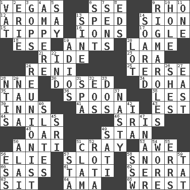 ACROSS 1. Viva Las _ 6. Compass dir. 9. 17th letter of the Greek alphabet 12. Scent 13. Drove too fast 14. The Jewish people; Israel 15. Likely to tip or tilt 16. Charged particles 17. Stare 18. Compass dir. 19. Pismires 20. Unable to walk 21. Travel on an animal 23. Mouth or opening 24. Painter Guido (1575-1642) 25. Laconic 28. Compass dir. 30. Administered medicine 34. Capital of the state of Qatar 35. The 19th letter of the Greek alphabet 36. Soup utensil 38. French article 39. Restaurants 41. Slender Brazilian palm 43. Eastern Standard Time (abbr.) 44. Moves on water 46. Indian titles of respect 48. Rowing implement 49. Comedian Laurel of Laurel & Hardy 50. Against 51. Supercomputer manufacturer 53. Deep reverence 56. Writer Wiesel 57. Narrow opening 58. Derisive sound 60. Backtalk 61. Jacques of French films 62. Spanish missionary in California 63. Be seated 64. Housemaid (var.) 65. Obtain by seizing forcibly or violently DOWN 1. Large container 2. 4th largest of the Great Lakes 3. Republicans 4. Electrical Unit 5. Declare 6. Specific locale 7. Elected reps. 8. Begley and Asner 9. Complicated, petty procedures 10. Opening into or through something 11. Single 13. Trig term 14. Flew 19. Goodbye (Sp.) 20. Car dealer's back yard 22. Indiana (abbr.) 24. One who advocates reunion 26. "______ My Girl" (Turtles hit) 27. 90 degrees 28. Nuclear Threat Initiatives 29. Nanny 31. Health resort 32. Greek goddess of the dawn 33. Two (Sp.) 37. Offensive 40. Chalkboards 42. Lyricist Gershwin 45. _ Lanka 47. More empty; more void 49. Suttee (variant) 50. Jai ____ 51. Burrowing marine mollusk 52. Roll call or roster of names 54. Had on 55. Blunders 56. Double-curved letter 57. R.R. building 58. Compass dir. 59. Make lace