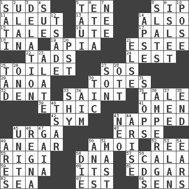 ACROSS 1. Beer foam 5. Nine, plus one 8. Small drink 11. Native American of Southwest Alaska 13. Had dinner 14. In addition 15. Stories 16. Shoshoni 17. Friends 18. _ tizzy (2 wds.) 19. Capital of Western Samoa 21. First name in cosmetics 22. Bits 24. For fear that 25. Bathroom plumbing fixture 27. Mayday 29. Small Philippine buffalo 30. Hauls 32. Scratch 33. Virtuous person 35. Story 39. Moral principle 41. Presage 42. Symbol (abbr.) 43. Slept 45. Capital and largest city of Mongolia 48. Celtic language 49. Approach 50. Mine, in Marseilles 52. To sift 55. Swiss mountan, "Queen of the Mountains" 56. Heredity factor (abbr.) 57. Any of the three canals of the cochlea 59. Inactive volcano in Sicily 60. ___ a Wonderful Life 61. _ Allan Poe 62. Ocean 63. Eastern Standard Time (abbr.) 64. Elected reps. DOWN 1. Suttee (variant) 2. ____ Bator 3. Conveyance 4. Take to court 5. "Change" in Tahitian 6. Singer James 7. Born 8. Narrow boards 9. Small island 10. Airs 12. Sadhe (variant) 14. Domed church section 20. Pacific Standard Time (abbr.) 21. Otherwise 23. Having winglike extensions 25. Bit 26. Single 27. Male child 28. Baseball player Mel 30. Nervous spasm 31. Halts 33. Like a shrinking violet 34. Direct toward a target or goal 36. Electrical Measurement 37. Area sheltered from the wind 38. Conclude 40. Russian ruler of old 43. Modern: prefix 44. Get up 45. Join together 46. Canadian anthropologist Darnell 47. Greek goddess of the earth (variant) 49. Ancient Greek god of war 50. Pismires 51. Vertical spar for supporting sails 53. Style 54. Hearing organs 56. Expire 58. Music discs