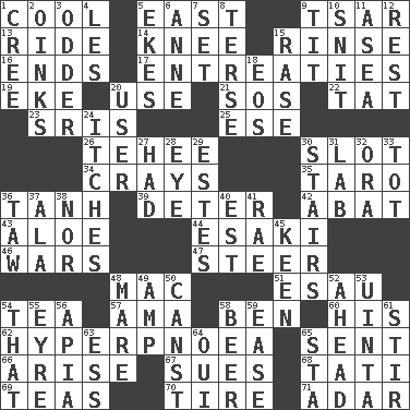 ACROSS 1. Calm and collected 5. 90 degrees 9. Russian ruler of old 13. Travel on or in a vehicle 14. Leg joint 15. Remove soap 16. Conclusions 17. Pleas 19. Supplement with great effort 20. Purpose 21. Mayday 22. Make lace 23. Indian titles of respect 25. Compass dir. 26. Giggle 30. Narrow, elongated depression 34. Trading vessels 35. Pacific island yam 36. Hyperbolic tangent 39. Prevent from occurring 42. Blind as ____ 43. _ vera 44. 1973 Nobel Price Winner (Physics) Leo 46. Armed conflicts 47. Guide 48. Apple computer (short form) 51. He sold his birthright 54. Afternoon social gathering 57. Housemaid (var.) 58. Benjamin's nick name 60. Part of HMS, perhaps 62. Abnormally rapid or deep breathing 65. Transmitted 66. Get up 67. Institutes legal proceedings 68. Jacques of French films 69. Afternoon social gatherings 70. Become fatigued 71. The sixth month of the Jewish calendar DOWN 1. Algonquian 2. Pig sounds 3. More peculiar 4. French article 5. Makes supply last 6. Singer Murray 7. Put into a specified state 8. Laconic 9. Teat (slang) 10. In a ____ (agitated or irritated) 11. Toward the sea 12. Relief 15. To erase 18. Greek goddess of the dawn 20. One who uses or employs something 24. Strong, restless desires 27. Possessed 28. Sight organ 29. _____ Park, CO 30. Flight of steps 31. Experiment locale 32. Mouth or opening 33. Small child 36. The 23rd letter of the Hebrew alphabet 37. In the manner of 38. And not 40. Eastern Standard Time (abbr.) 41. Actress Charlotte 45. Peachy ____! 48. Female horse 49. Electrical Unit 50. 2nd pers. sing. pres. of can (arch.) 52. Having the leading position 53. National forest in Provo, Utah 54. Not this but _ 55. Jane of fiction 56. Capital of Western Samoa 58. Fermented drink made from hops 59. Relaxation 61. Use a spoon 63. Double-curved letter 64. Fr. "Yes" 65. R.R. building