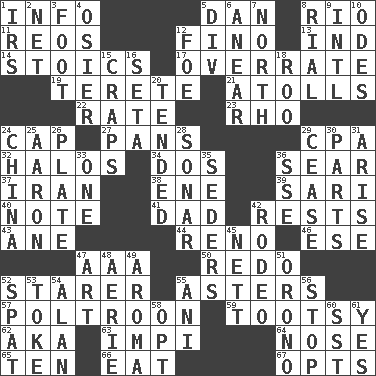 ACROSS 1. Information 5. Daniel's nick name 8. River (Sp.) 11. Vintage cars 12. Fine (Spanish) 13. Indiana (abbr.) 14. Unemotional ones 17. Make much ado about nothing 19. Cigar-shaped 21. Ringlike coral islands and reefs 22. Assign a rank or rating to 23. 17th letter of the Greek alphabet 24. Head covering 27. Baking dishes 29. Numbers guy (abbr.) 32. Radiant circles of light 34. Two (Sp.) 36. Wither 37. SW Asia republic 38. Compass dir. 39. Indian skirt 40. Observe 41. June honoree 42. Musical pauses 43. One (Scot) 44. Former U.S. Attorney General Janet 46. Compass dir. 47. Auto club (abbr.) 50. Make new 52. A viewer who gazes fixedly 55. Michaelmas daisies 57. Characterized by complete cowardliness 59. Tootsie (variant) 62. Alias (abbr.) 63. Body of Kaffir warriors 64. Sense of smell 65. "___ Little Indians" 66. Consume 67. Elects DOWN 1. Big collection agency 2. Fish or hair follower 3. 12 inches 4. Flexible twig of a willow tree 5. HTML Container Element 6. Approach 7. 0 degrees 8. Monetary unit of Yemen 9. International (abbr.) 10. Lyric poems 12. Enemy 15. Dice game 16. Bristle 18. Friend of Pooh 20. Watched over 24. Large country 25. Composer Copland 26. Food holder 28. Echolocation 29. Stop 30. Components 31. Originate 33. Single 35. Spring feasts 36. Compass dir. 42. Cowboy competition 45. Remaining after all deductions 47. Nonscientific branch of learning 48. Nest on high 49. Odor 51. U. of Maine site 52. Petty quarrel 53. Puff or smoke 54. Actor Alda or Thicke 55. Black tropical American cuckoo 56. Discontinue 58. Choose 60. Fast jet (abbr.) 61. Affirmative reply