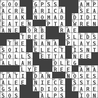 ACROSS 1. Thick or sticky substance 4. Global Positioning Systems (abbr.) 8. Electrical Unit 11. 1/640 square mile 13. N. Chile seaport 15. Ocean 16. Path through which fluid escapes 17. Wanderer 18. "You Light Up My Life" star Conn 19. Consumed 21. Parent Teacher Assoc. 22. Songbird 23. A saturated hydrocarbon 24. Globe 27. Actress Charlotte 29. Woody plant 30. Bobsleighs 34. Definite Article 36. Grandmother 39. Romps 40. The visible part of the earth's surface 41. Voters do this 43. Is not 44. For Whom the Bell _____ 46. Singer James 47. Born 48. Assad's deity 49. Cassini of fashion 51. Sodium hydroxide 53. To sift 54. Nanny (var.) 57. Jacques of French films 60. Daniel's nick name 63. Olfactory organs 65. Toward shelter 66. Sibling's daughter 69. Fast planes 70. Girls' org. (abbr.) 71. Goodbye (Sp.) 72. Conductor's collection 73. Distress signal 74. High mountains 75. Electrically charged atom DOWN 1. An organ shaped like a helmet 2. Sea 3. Speak pompously 4. Separate the seeds from cotton 5. Adept person 6. Simple or foolish person 7. Scram! 8. SW Saudi Arabia district 9. Ancient Persian 10. Ache 12. Supplement with great effort 14. The sixth month of the Jewish calendar 18. Residence 20. And not 25. French philosopher Descartes 26. Memphis, Tenn. Street 28. Viper 29. Copy Pinocchio 31. Relaxation 32. Centimeter-gram-second unit of force 33. Fast jet (abbr.) 34. Instrument 35. Land elevation 37. Fish or hair follower 38. Thespian 40. R.R. building 42. Lie 45. Like a shrinking violet 50. Car or cant ending 52. Pulitzer Prize-winning author Ferber 54. Slender Brazilian palm 55. Paris' subway 56. NE Netherlands city 57. Labels 58. In addition 59. Beverages made from leaves 61. Opera by Verdi 62. Famous astronaut Armstrong 64. Order of Saint Francis (abbr.) 67. Police officer (slang) 68. Double-curved letter