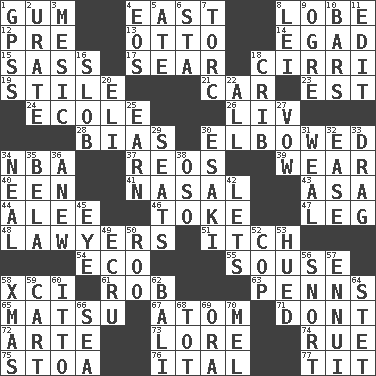 ACROSS 1. Chewing product 4. 90 degrees 8. Ear part 12. Before (prefix) 13. "Beetle Bailey" pooch 14. Mild oath 15. Backtalk 17. Dry up 18. High-altitude cloud 19. Vertical member of a panel or frame 21. Automobile 23. Eastern Standard Time (abbr.) 24. Learning spot: Fr. 26. 54 in ancient Rome 28. Prejudice 30. Turned at an angle; bent 34. Basketball assoc. 37. Vintage cars 39. Put on (as clothing) 40. Car or cant ending 41. Rhinal 43. White ___ sheet 44. Toward shelter 46. Casino tip 47. Part of a journey 48. Those who practice law 51. Hankering 54. Environmental prefix 55. Lush 58. One more than ninety 61. Director Reiner 63. Actor Sean's family 65. Taiwanese island in East China Sea 67. Smallest unit of an element 71. Do not 72. Johnson of "Laugh-In" 73. Old wives' tales, e.g. 74. Sorrow 75. Portico 76. Slanted text style (abbr.) 77. Teat (slang) DOWN 1. Global Positioning Systems (abbr.) 2. A salt of uric acid 3. Of or pertaining to a meson 4. Greek goddess of the dawn 5. Had dinner 6. R.R. building 7. Torque (variant) 8. Luau accessory 9. Legendary monster 10. Soap units 11. Prepare for publication 16. Oscar Madison type 18. Baby bed with high sides 20. Connecticut Ivy Leaguer 22. 100% 25. Merit 27. Solemn pledge 29. Theater features 30. 1973 Nobel Price Winner (Physics) Leo 31. Welt 32. Relaxation 33. To trail on the ground 34. Anneal 35. Actor Lugosi 36. Afresh 38. Bear (Spanish) 42. Allows 45. Sight organ 49. Shade of tan 50. Friend of Pooh 52. Police officer (slang) 53. Became colored 56. Derisive sound 57. World-weariness 58. Dec. holiday 59. Heavy open wagon 60. "Tell ____ the Marines!" 62. Indonesian resort city 64. Proofreading order 66. Ocean 68. Small child 69. Mouth or opening 70. Cartoonist voice _ Blanc