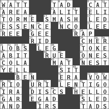 ACROSS 1. Electrical Unit 5. Bit 8. Domesticated feline 11. Type of rug 12. Came down and settled, as after flight 14. Connecticut Ivy Leaguer 15. Singer Mel 17. Box-office sellout 18. Directed 19. Gist 21. Non-commissioned officer (abbr.) 22. Area sheltered from the wind 23. To sift 24. Unit of force equal to gravity 25. Reproach for some lapse or misdeed 27. To free from 28. "Mermaids" star 31. Tennis shots 35. Part of a journey 37. Casino tip 38. "This won't hurt ____!" 39. Sorrow 41. Singles 42. Root beer relative 43. Floor protector 45. Egg locale 46. Shout 47. Be seated 49. Benjamin's nick name 51. Period 52. Solemn pledge 55. River (Sp.) 57. RI univ. 60. Small, flat, pigmented spot on the skin 62. Retirement account (abbr.) 63. Plates 65. Phone greeting 66. Slender fish 67. Mild oath 68. Downhill vehicle 69. Plus 70. Big collection agency 71. Bits DOWN 1. Wetness 2. Came up 3. Laconic 4. Docile 5. Scottish cap 6. Actor Alda or Thicke 7. Plate 8. Portable communications device 9. Toward shelter 10. Periodic rise and fall of the sea level 13. Son of Odin 16. Engineer (abbr.) 17. Sowing specialist 20. To provide with a ceiling 26. Gambison 29. Supplements with great effort 30. Relief 31. Made of lace 32. Mitch Miller's instrument 33. Big road sign 34. Showing deterioration from age 36. Chewing product 40. Artist's stands 44. Hoop that covers a wheel 48. Hyperbolic tangent 50. Naked 52. Country residence 53. Stared 54. Forest 55. Port city in Latvia 56. SW Asia republic 58. Swiss mountan, "Queen of the Mountains" 59. Austrian river, tributary to the Danube 61. Trial 64. Music discs
