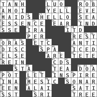 ACROSS 1. Hyperbolic tangent 5. Nilotic language 8. Director Reiner 11. Mine, in Marseilles 12. Shout 14. Night before a holiday 15. Women servants 17. Phone greeting 18. Ocean 19. Center 21. Hearing organ 22. Working for oneself (abbr.) 23. Compass dir. 24. Lyricist Gershwin 25. It would 27. For each 28. Respite 31. Mouths or openings 35. And so on (abbr.) 37. Against 38. Flat circle 39. Health resort 41. On the rocks 42. Otherwise 43. "We ___ not amused" (Victoria) 45. Wig 46. It's straight from the horse's mouth 47. Music discs 49. R.R. building 51. Afternoon social gathering 52. ___ good deed 55. Plant holder 57. Allow 60. Motivate 62. _ tizzy (2 wds.) 63. Mesonic 65. Underwater navigation system 66. Car or cant ending 67. Jai _ 68. Suttee (variant) 69. Fast jet (abbr.) 70. Indian title of respect (Mr.) 71. Family _ (genealogy) DOWN 1. Corrects by punishment or discipline 2. Collect or gather 3. Annoying sound 4. Flintstone garb 5. Potassium hydroxide 6. Ubangi River tributary 7. Water jar 8. Home 9. Baking chamber 10. Necklace unit 13. Australian parrot (variant) 16. Sever or remove by pinching or nipping 17. Centers of feelings and intuitions 20. Algonquian 26. Distinguishing feature 29. Proofreading order 30. Periodic rise and fall of the sea level 31. Baltic tributary 32. Cause heat under the collar 33. Helper 34. Aroma 36. Tax preparer (abbr.) 40. Northern region 44. Paradise 48. Backtalk 50. _ mater 52. Middle Eastern gold or silver currency 53. Declaim 54. Nest on high 55. Sliced desserts 56. Washington bills 58. Snakelike fish 59. Russian ruler of old 61. Mail 64. One more than two