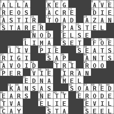 ACROSS 1. Silent film actress Nazimova 5. Barrel 8. "___ Maria" 11. Vintage cars 12. Land measure 14. Expire 15. Moving or stirring 17. Frog relative 18. Muslim summons to prayer 19. A viewer who gazes fixedly 21. Soft color 23. Lower and raise head in agreement 25. Otherwise 26. Pale green bean 27. Put into a specified state 28. Enemy 31. 54 in ancient Rome 33. Sliced dessert 35. Theater features 37. Swiss mountan, "Queen of the Mountains" 38. Plant excrement 40. Pismires 41. Shun 43. Three (prefix) 45. Friend of Pooh 46. For each 47. Compete 50. SW Asia republic 52. Pulitzer Prize-winning author Ferber 53. Cartoonist voice _ Blanc 54. Sunflower state 56. Flew 61. Hearing organs 62. Remaining after all deductions 65. Wear away 66. Federal power corp. 67. Writer Wiesel 68. Tending to cause great harm 69. Island 70. R.R. building 71. Stitch closed the eyes of (a falcon) DOWN 1. Caspian sea tributary 2. For fear that 3. Globular water bottle used in Asia 4. SW Saudi Arabia district 5. Krazy ___ of comics 6. Environmental prefix 7. Wine fruits 8. Edge tool used to cut and shape wood 9. Small bottle 10. Car or cant ending 13. Peak District village in England 16. Painter Guido (1575-1642) 18. Had dinner 20. Frolic 22. Fast planes 24. Raised platform 26. 57 in ancient Rome 28. Papal veil 29. Von Bismarck 30. Double-curved letter 31. Not recorded 32. Russian composer Stravinsky 34. Ingest 36. Merit 37. Reproach for some lapse or misdeed 39. Demure 42. Movie discs 44. Angers 48. Silly 49. Artist's stands 51. Medicinal plant 52. Followers of ems 54. Polynesian shrub of the pepper family 55. Like ___ of sunshine 57. Ancient Greek god of war 58. Be footloose 59. Singer Brickell 60. Small valley 61. And so on (abbr.) 63. Teat (slang) 64. Beverage made from leaves