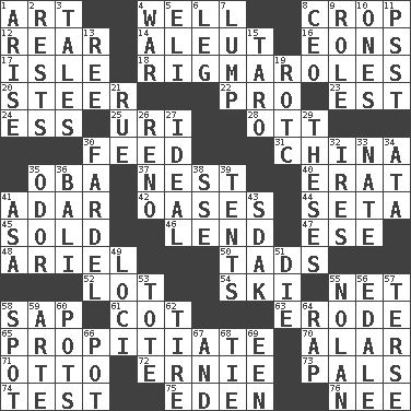 ACROSS 1. Tate display 4. Water source 8. Riding implement 12. Located in or toward the back 14. Native American of Southwest Alaska 16. Immeasurably long periods of time 17. Capri or Wight 18. Complicated, petty procedures 20. Bull 22. Adept person 23. Eastern Standard Time (abbr.) 24. Curvy letter 25. RI univ. 28. Baseball player Mel 30. Nourish 31. Large country 35. Chief or king in Benin or Nigeria 37. A home for chicks 40. Part of Q.E.F. 41. The sixth month of the Jewish calendar 42. Fertile tracts in a desert 44. Stalk of a moss capsule 45. Exchanged or delivered for money 46. Grant temporary use of 47. Compass dir. 48. Satellite of Uranus 50. Small boys 52. Car dealer's back yard 54. What Jean-Claude Killy likes to do 55. Fish or hair follower 58. Plant excrement 61. Small bed 63. Eat (away) 65. Conciliate 70. Having or resembling wings 71. Von Bismarck 72. Bert's buddy 73. Friends 74. Trial 75. Paradise 76. Born DOWN 1. Ascend 2. Musical pauses 3. Lies 4. Armed conflict 5. Connecticut Ivy Leaguer 6. Part of a journey 7. Mass 8. Corporate head (abbr.) 9. Hero or heavy, e.g. 10. Washington bills 11. Inconspicuous attention getter 13. To riddle 15. Pacific island yam 19. College mil. group 21. Regret 26. Former U.S. Attorney General Janet 27. Standard of perfection 29. College papers 30. Burden 32. Angers 33. Nathan's nickname 34. _ moment's notice (2 wds.) 35. Scent 36. Indonesian resort city 38. Compass dir. 39. Portable shelters 41. White ___ sheet 43. Neighbor of Neb. 49. Locales 51. Expire 53. Lug 55. Pitcher Ryan 56. Peak District village in England 57. Laconic 58. Specific locale 59. Johnson of "Laugh-In" 60. Plant holders 62. Hoop that covers a wheel 64. Strike 66. Cooking vessel 67. Added to 68. Standoff 69. Car or cant ending