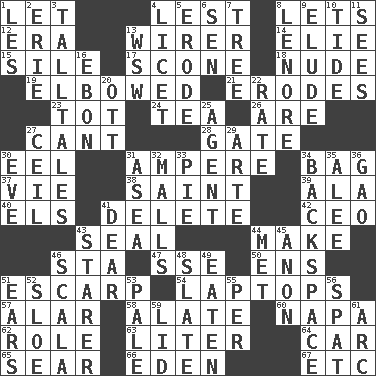 ACROSS 1. Allow 4. For fear that 8. Allows 12. Epoch 13. One who wires 14. Writer Wiesel 15. Filth; sediment 17. Biscuitlike quick bread 18. Naked 19. Shoved, as through a crowd 21. Eats (away) 23. Small child 24. Afternoon social gathering 26. "We ___ not amused" (Victoria) 27. Patter 28. Yard entry 30. Snakelike fish 31. Electrical Unit 34. Paper or plastic container 37. Compete 38. Virtuous person 39. Wing 40. Raised railways 41. Erase 42. Corporate head (abbr.) 43. Lick closed 44. Cause to be 46. R.R. building 47. Compass dir. 50. Followers of ems 51. Fortification 54. Portable computers 57. Having or resembling wings 58. Having winglike extensions 60. California wine valley 62. Hero or heavy, e.g. 63. 61 cubic inches 64. Auto 65. Shrivel 66. Locale of original sin 67. And so on (abbr.) DOWN 1. French article 2. 4th largest of the Great Lakes 3. Baron Munchausen's specialties 4. It is permitted: Lat. 5. Eat (away) 6. Elected rep. 7. Relationship diagram 8. Poe poem 9. Dodge 10. Event that recurs at intervals 11. Observes 13. Compass dir. 16. Inky black, to poets 20. Baseball player Mel 22. Assign a rank or rating to 25. Representative 27. To provide with a ceiling 29. Johnson of "Laugh-In" 30. First lady 31. At sea 32. Shopping centers 33. Sliced dessert 34. Keyboard key 35. Toward shelter 36. E Mali city 41. Letter starter 43. A viewer who gazes fixedly 44. Was introduced to 45. At once, immediately (arch.) 46. Any of the three canals of the cochlea 48. Chalkboard 49. Ingested 51. Hearing organs 52. A type of plum 53. Diluted with white 55. For each 56. Argument over a trivial matter 59. Hat (slang) 61. Curve