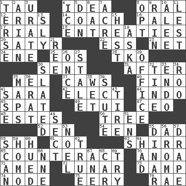 ACROSS 1. The 19th letter of the Greek alphabet 4. The main thing one is thinking about 8. Spoken 12. Blunders 14. Team commander 16. Diluted with white 17. Monetary unit of Yemen 18. Pleas 20. Man with strong sexual desires 22. Double-curved letter 23. Fish or hair follower 24. Compass dir. 25. Greek goddess of the dawn 28. Ring climax 30. Emitted 31. Following 35. Cartoonist voice _ Blanc 37. Crow sounds 40. Fine (Spanish) 41. "Two Mules for Sister ____" 42. Voters do this 44. _ china 45. Argument over a trivial matter 46. Needle case 47. Corporate head (abbr.) 48. _____ Park, CO 50. Relationship diagram 52. Lair 54. Car or cant ending 55. Male parent 58. Quiet! 61. Small bed 63. Bake eggs in their shells 65. Act in opposition 70. Small Philippine buffalo 71. So be it 72. Type of eclipse 73. Moist 74. Connecting point 75. Suggestive of the supernatural 76. Actress Charlotte DOWN 1. Laconic 2. Believer in; advocate of (suffix) 3. A salt of uric acid 4. Frozen water 5. Spanish title 6. Erode 7. 1/640 square mile 8. Choose 9. Water falling in drops from the sky 10. Toward shelter 11. For fear that 13. Cunning 15. Behest 19. "____ silly question..." 21. To riddle 26. Single time 27. Lacking originality or spontaneity 29. Place of business 30. Scheduled 32. Prong on a fork 33. Inside; within (prefix) 34. Friend of Pooh 35. Atlas contents 36. Part of Q.E.F. 38. Soggy 39. Snake scale 41. Compass dir. 43. Hoop that covers a wheel 49. Religious group 51. Followers of ems 53. Christmas carol 55. Middle Eastern gold or silver currency 56. Scent 57. Window treatment 58. Skim 59. Same (prefix) 60. Became colored 62. Loyal 64. Possessed 66. Compass dir. 67. One (Scot) 68. 4-wheeled motor vehicle 69. Attempt