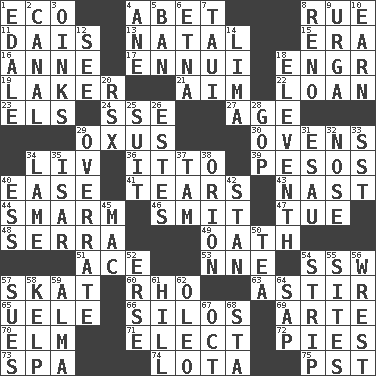 ACROSS 1. Environmental prefix 4. Collude with 8. Regret 11. Raised platform 13. Brizilian seaport 15. Epoch 16. Queen of England 1702-14 17. World-weariness 18. Engineer (abbr.) 19. Member of a famous L.A. basketball team 21. Direct toward a target or goal 22. Grant temporary use of 23. Raised railways 24. Compass dir. 27. Ripen 29. Amu Darya 30. Baking chambers 34. 54 in ancient Rome 36. "Tell ____ the Marines!" 39. Mexican monetary units 40. Relaxation 41. Lacerates 43. Political cartoonist Thomas 44. Excessive but superficial compliments 46. Stricken, poetically 47. Third day of the wk. 48. Spanish missionary in California 49. Pledge 51. Adept person 53. Compass dir. 54. Compass dir. 57. Three-handed card game 60. 17th letter of the Greek alphabet 63. Being in motion 65. Ubangi River tributary 66. Grain storage towers 69. Johnson of "Laugh-In" 70. Shade tree 71. Choose 72. Sliced desserts 73. Health resort 74. Globular water bottle used in Asia 75. Pacific Standard Time (abbr.) DOWN 1. Peak District village in England 2. Lessep's creation 3. Pig sounds 4. One (Scot) 5. Bar 6. Inactive volcano in Sicily 7. "Change" in Tahitian 8. Western Nevada city 9. Capital and largest city of Mongolia 10. Merit 12. Perceive with the eye 14. Pale green bean 18. Veterans Day date 20. Acura sports coupe 25. Set or collection 26. _____ Park, CO 28. Grand Old Party 29. Make much ado about nothing 31. He sold his birthright 32. Sense of smell 33. Fast jet (abbr.) 34. Unable to walk 35. Austrian river, tributary to the Danube 37. Scottish cap 38. Greek mythologigal hunter 40. Curvy letter 42. Comedian Laurel of Laurel & Hardy 45. Apple computer (short form) 50. Afternoon social gathering 52. Celtic language 54. Empty completely 55. Locates 56. Obtain by seizing forcibly or violently 57. Institutes legal proceedings 58. Seaweed 59. _ mater 61. Land elevation 62. Butter sub 64. Plant excrement 67. Sep. follower 68. R.R. building