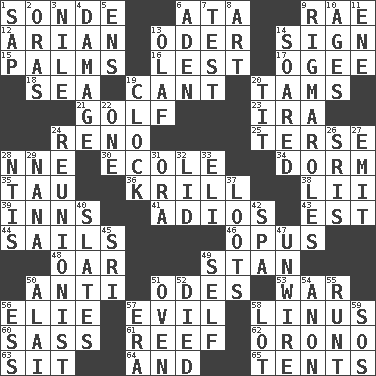 ACROSS 1. Message 6. "One Day ___ Time" 9. Actress Charlotte 12. Believer in; advocate of (suffix) 13. Baltic tributary 14. Omen 15. Insides of hands 16. For fear that 17. Double curve, resembling the letter S 18. Ocean 19. Patter 20. Scottish caps 21. Eighteen holes 23. Lyricist Gershwin 24. Western Nevada city 25. Laconic 28. Compass dir. 30. Learning spot: Fr. 34. Dormintory (informal) 35. The 19th letter of the Greek alphabet 36. Shrimp-like planktonic crustaceans 38. Cards in a Roman deck? 39. Taverns 41. Goodbye (Sp.) 43. Eastern Standard Time (abbr.) 44. Moves on water 46. Musical composition 48. Boat paddle 49. Comedian Laurel of Laurel & Hardy 50. Against 51. Lyric poems 53. Armed conflict 56. Writer Wiesel 57. Tending to cause great harm 58. "_ and Lucy" (Charlie Brown theme song) 60. Backtalk 61. Coral collection 62. U. of Maine site 63. Be seated 64. Plus 65. Portable shelters DOWN 1. Plant excrement 2. Mouths or openings 3. "Death on the ____" 4. Break 5. Followers of ems 6. Arabian gulf 7. Trial 8. Nonscientific branch of learning 9. Complicated, petty procedures 10. Eons 11. Compass dir. 13. Norwegian king 14. Flew 19. Timepiece 20. Teat (slang) 22. Single 24. One who advocates reunion 26. Indian titles of respect 27. Send forth 28. Nuclear Threat Initiatives 29. Grandmother 31. Mouth or opening 32. Flaplike covering 33. Biblical high priest 37. Plunders 40. Chalkboards 42. Health resort 45. Indian title of respect (Mr.) 47. Undo the wiring of 49. Oneself 50. Jai ____ 51. Baking chamber 52. Passed on 54. At once, immediately (arch.) 55. Undersized animal 56. Curvy letter 57. Epoch 58. Car dealer's back yard 59. Mayday