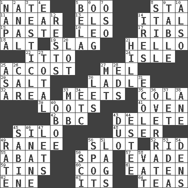 ACROSS 1. Nathan's nickname 5. Oct. 31 cry 8. R.R. building 11. Approach 13. Raised railways 14. Slanted text style (abbr.) 15. Thick mixture 16. Lion 17. Chest bones 18. The first octave above the treble staff 19. Volcanic refuse 21. Phone greeting 22. "Tell ____ the Marines!" 24. Capri or Wight 25. Buttonhole 27. Cartoonist voice _ Blanc 29. Table seasoning 30. Dipping utensil 32. Length times width 33. Confronts 35. Root beer relative 39. Plunders 41. Baking chamber 42. English channel? 43. Keyboard key 45. Grain storage tower 48. One who uses or employs something 49. The wife of a rajah (variant) 50. Slit 52. To free from 55. Blind as ____ 56. Health resort 57. Dodge 59. Metal containers 60. Gear tooth 61. Eroded 62. Compass dir. 63. ___ a Wonderful Life 64. Afternoon social gatherings DOWN 1. California wine valley 2. Of or related to the anus 3. A testis 4. Erode 5. Actor Lugosi 6. Cassini of fashion 7. Bear (Spanish) 8. Free from disturbance or agitation 9. Eating place 10. In addition 12. Musical pauses 14. Angers 20. Car dealer's back yard 21. Land elevation 23. "_____ Recall" 25. White ___ sheet 26. 4-wheeled motor vehicle 27. Floor covering 28. Begley and Asner 30. French article 31. Learning spot: Fr. 33. Crowd into 34. And so on (abbr.) 36. Make much ado about nothing 37. Allow 38. A saturated hydrocarbon 40. Mitch Miller's instrument 43. Superhero pair 44. First name in cosmetics 45. Unit of acoustic absorption 46. Silly 47. Allows 49. Assign a rank or rating to 50. Specific locale 51. Falls behind 53. It may be bright or harebrained 54. Hiding places for outlaws 56. _-fi 58. Large container