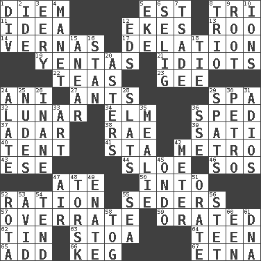 ACROSS 1. South Vietnam president (1954) 5. Eastern Standard Time (abbr.) 8. Three (prefix) 11. The content of cognition 12. Makes supply last 13. Friend of Pooh 14. Actresses Bloom and Felton 17. Accusation by an informer 19. Gossips 21. Foolish or stupid persons 22. Beverages made from leaves 23. Turn to the right 24. Black tropical American cuckoo 27. Pismires 29. Health resort 32. Type of eclipse 34. Shade tree 36. Moved rapidly 37. The sixth month of the Jewish calendar 38. Actress Charlotte 39. Suttee (variant) 40. Portable shelter 41. R.R. building 42. Paris' subway 43. Compass dir. 44. A type of plum 46. Mayday 47. Had dinner 50. To the inside or interior of 52. Food allowance for one day 55. Spring feasts 57. Make much ado about nothing 59. Spoke pompously 62. Shallow baking pan 63. Portico 64. Adolescent 65. Increase 66. Cask 67. Inactive volcano in Sicily DOWN 1. HTML Container Element 2. Binary compound 3. Suggestive of the supernatural 4. French painter Edouard 5. Supplement with great effort 6. Former Milwaukee Brewers owner Bud 7. Sadhe (variant) 8. Musical group of three 9. Carrot, for example 10. Charged atoms 12. Begley and Asner 15. Approach 16. Comedian Laurel of Laurel & Hardy 18. Neckwear 20. Michaelmas daisies 24. Having winglike extensions 25. Unclothed pictures 26. Empty; void 28. Narrow boards 29. Arguments over trivial matters 30. Stone: prefix 31. Goodbye (Sp.) 33. Tate display 35. Ear of corn 36. Compass dir. 42. Distance measurement 45. Southwest Nigerian state 47. Wind 48. Cod relative 49. Related on the mother's side 51. Speak pompously 52. Round or rotation of duties 53. Enthusiastic 54. Look after 55. Ocean 56. Proofreading order 58. Coat; cloak 60. Car or cant ending 61. Heredity factor (abbr.)
