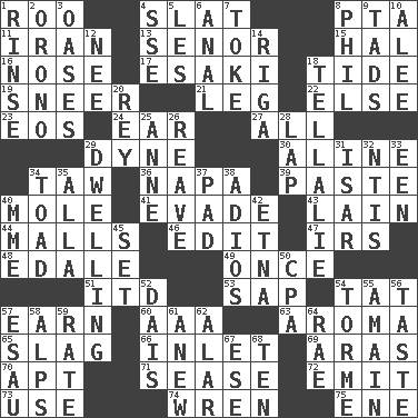 ACROSS 1. Friend of Pooh 4. Narrow board 8. Parent Teacher Assoc. 11. SW Asia republic 13. Sir (Sp.) 15. Actor Linden 16. Sense of smell 17. 1973 Nobel Price Winner (Physics) Leo 18. Periodic rise and fall of the sea level 19. Contemptuous expression 21. Part of a journey 22. Otherwise 23. Greek goddess of the dawn 24. Ewer handle 27. 100% 29. Unit of force 30. Place in a line 34. The 23rd letter of the Hebrew alphabet 36. California wine valley 39. Thick mixture 40. Undercover agent 41. Dodge 43. (Had) reclined 44. Promenades 46. Prepare for publication 47. Big collection agency 48. Peak District village in England 49. At one time in the past 51. It would 53. Plant excrement 54. Make lace 57. Merit 60. Auto club (abbr.) 63. Scent 65. Volcanic refuse 66. An arm off of a larger body of water 69. Caspian sea tributary 70. Fitting 71. Gospel singer Marvin 72. Give off 73. Purpose 74. Songbird 75. Compass dir. DOWN 1. Remove soap 2. U. of Maine site 3. Fertile tracts in a desert 4. Compass dir. 5. French article 6. Of or related to the anus 7. Puff or smoke 8. Silvers or Donahue 9. Small amounts or degrees 10. Toward shelter 12. Born 14. Port city in Latvia 18. Copy Pinocchio 20. Marina Del _, California 25. Queen of England 1702-14 26. Break or tear apart 28. Infant locale 29. Home 31. Austrian river, tributary to the Danube 32. Nuclear Threat Initiatives 33. Car or cant ending 34. Frog relative 35. Silent film actress Nazimova 37. Writing tablet 38. Goodbye (Sp.) 40. Madame (abbr.) 42. Inactive volcano in Sicily 45. Put into a specified state 50. Numbers guy (abbr.) 52. Raised platform 54. Singer Mel 55. With great haste 56. Clothes sense 57. He sold his birthright 58. High mountains 59. Pace 61. Afresh 62. Having or resembling wings 64. Actress Charlotte 67. Compass dir. 68. Nine, plus one