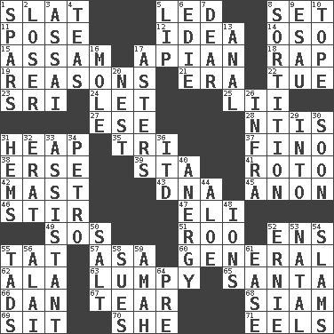 ACROSS 1. Narrow board 5. Directed 8. Put into a specified state 11. Introduce or present, as a question 12. The content of cognition 14. Bear (Spanish) 15. Indian state 17. Bee-related 18. Strike 19. Thinks logically 21. Epoch 22. Third day of the wk. 23. Indian title of respect (Mr.) 24. Allow 25. Cards in a Roman deck? 27. Compass dir. 28. Nuclear Threat Initiatives 31. Pile 35. Three (prefix) 37. A pale, very dry sherry 38. Celtic language 39. R.R. building 41. Printing process, for short 42. Vertical spar for supporting sails 43. Heredity factor (abbr.) 45. Soon (poet.) 46. Commotion 47. Biblical high priest 49. Distress signal 51. Friend of Pooh 52. Followers of ems 55. Make lace 57. White ___ sheet 60. Commissioned military rank 62. Insect wing 63. Containing lumps 65. Before Barbara or Clara 66. Daniel's nick name 67. Rend 68. Thailand, formerly 69. Be seated 70. A female animal or person 71. Snakelike fish DOWN 1. Practice fights 2. Failure 3. Slender Brazilian palm 4. Beverages made from leaves 5. Mouth edge 6. Singer Brickell 7. Letter starter 8. Casting lots 9. He sold his birthright 10. Drink excessively 13. Of or related to the anus 16. Undercover agent 17. Michaelmas daisies 20. A home for chicks 26. Kind of red light 29. To the inside or interior of 30. Within a short period 31. Equivocates 32. Part of Q.E.F. 33. Aide 34. Stone: prefix 36. It would 40. Disorder of the immune system 44. _ vera 48. Charged atoms 50. Table seasoning 52. Bert's buddy 53. Relating to or accompanying birth 54. Criticizes harshly 55. Bits 56. Jai ____ 58. Institutes legal proceedings 59. Wet nurse 61. Comfort 64. Before (prefix)