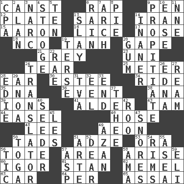ACROSS 1. 2nd pers. sing. pres. of can (arch.) 6. Hit sharply and swiftly 9. Fenced enclosure 12. Food holder 13. Indian skirt 14. SW Asia republic 15. Composer Copland 16. Louse (plural) 17. Sense of smell 18. Non-commissioned officer (abbr.) 19. Hyperbolic tangent 20. Stare wonderingly 21. Jennifer or Joel 23. Corn or form start 24. Pull into pieces 25. Distance measurement 28. Ewer handle 30. First name in cosmetics 34. Travel on or in a vehicle 35. Heredity factor (abbr.) 36. Happening 38. Santa ___, CA 39. Charged atoms 41. Tree or shrub in the Birch family 43. Scottish cap 44. Artist's stand 46. Flexible conduit 48. Area sheltered from the wind 49. Period of immesurable duration 50. Small boys 51. Edge tool used to cut and shape wood 53. Mouth or opening 56. Carry 57. Length times width 58. Originate 60. Composer Stravinsky 61. Comedian Laurel of Laurel & Hardy 62. Klaipeda city 63. Auto 64. For each 65. Slender Brazilian palm DOWN 1. Tax preparer (abbr.) 2. Actor Alda or Thicke 3. Drug cop 4. Moe Howard, for one 5. Nine, plus one 6. Water falling in drops from the sky 7. Bowlike part 8. Sliced dessert 9. Conciliate 10. Relaxation 11. Compass dir. 13. Kill 14. Sillier 19. Laconic 20. Chewing product 22. Actress Charlotte 24. Interpreter 26. Pulitzer Prize-winning author Ferber 27. 480, 500 or 516 sheets of paper 28. Singer Brickell 29. Small Philippine buffalo 31. Federal power corp. 32. Snakelike fish 33. Conclude 37. Giggle 40. Sowing specialist 42. Friend of Pooh 45. French article 47. Sounds asleep 49. Muslim summons to prayer 50. Ancient Roman robe 51. Johnson of "Laugh-In" 52. Letter starter 54. Basketball hoops 55. Toward the sea 56. Nervous spasm 57. Viper 58. Nanny (var.) 59. Biblical high priest