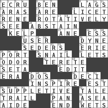 ACROSS 1. Shade of tan 5. Benjamin's nick name 8. Straggles 12. Ancient river in northeast Turkey 13. "We ___ not amused" (Victoria) 14. It is permitted: Lat. 15. French philosopher Descartes 16. Happening in regular succession 19. Observe 20. Refrain by choice 21. Seaweed 23. One (Scot) 24. Curvy letter 27. One who uses or employs something 30. Unit of force 31. Spring feasts 34. 4th largest of the Great Lakes 35. Sweet dark-red dessert wine 38. Slow-paced one 40. Allows 41. Scent 42. Cigar-shaped 44. Stalk of a moss capsule 45. Prepare for publication 46. Epoch 47. Two (Sp.) 50. Tenth: prefix 53. Motivate 57. Eastern Standard Time (abbr.) 59. Supplementary 63. Lie 64. Lag or linger behind 65. Baking dish 66. Toward the sea 67. Assistant 68. Conclusion 69. Soaks DOWN 1. Hearing organs 2. Small stream 3. Indian princess (variant) 4. Purpose 5. Sharp remark 6. Greek god of love 7. Remaining after all deductions 8. 54 in ancient Rome 9. Adept person 10. Set 11. Filthy place 14. Actor's bit 17. American Automobile Association (abbr.) 18. Metal container 20. Domed church section 22. A period of five years 24. Jane of fiction 25. In a ____ (agitated or irritated) 26. Observes 28. Begley and Asner 29. Monthly bill 30. Keyboard key 32. Actress Charlotte 33. The founder of a family 35. Introduce or present, as a question 36. Baltic tributary 37. Round or rotation of duties 39. Directed 43. Event that recurs at intervals 47. Deli pickle 48. Single 49. Fast jet (abbr.) 51. Stop 52. Small island 54. Corncob 55. "Terrible" tsar 56. Tear apart 58. Afternoon social gatherings 59. R.R. building 60. RI univ. 61. Writing tablet 62. Sliced dessert 63. The 23rd letter of the Hebrew alphabet