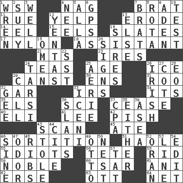 ACROSS 1. Compass dir. 4. Tired old horse 7. Naughty child 11. Sorrow 12. Sharp bark 13. Eat (away) 14. Snakelike fish 15. Snakelike fish 16. Chalkboards 17. High-strength synthetic material 19. Aide 21. Mountains (abbr.) 23. Angers 24. Beverages made from leaves 25. Grow older 26. Frozen water 29. 2nd pers. sing. pres. of can (arch.) 30. Followers of ems 31. Friend of Pooh 32. Slender fish 33. Big collection agency 34. ___ a Wonderful Life 35. Raised railways 36. _-fi 37. Desist 40. Connecticut Ivy Leaguer 41. Area sheltered from the wind 42. Expression of disdain 43. Examine hastily 45. Had dinner 46. Conclusion 51. White Person, in Hawaii 55. Foolish or stupid persons 56. False hair 58. To free from 59. Impressive in appearance 60. Russian ruler of old 61. Cuckoo 62. Celtic language 63. Baseball player Mel 64. Fish or hair follower DOWN 1. Songbird 2. Chop _ 3. Not ill 4. Born 5. Silent film actress Nazimova 6. Global Positioning Systems (abbr.) 7. Naughty children 8. Roll call or roster of names 9. Arabian gulf 10. Trial 12. Gossips 13. Otherwise 16. Founders of families 18. Sign of something about to happen 20. Attaches a signature 22. Fast jet (abbr.) 24. Tarsus (plural) 25. Nest on high 26. From or relating to Ireland 27. ____ d'Azur (French Riviera) 28. Greek goddess of the dawn 29. Give a ring to 32. Turn to the right 33. Ancient Celtic tribe of eastern Britain 36. Narrow boards 37. Numbers guy (abbr.) 38. One or the other 39. At sea 43. Took without asking 44. Quote 46. Trig term 47. Aroma 48. Chest bones 49. Von Bismarck 50. Egg locale 52. NW Algerian seaport 53. Actor's bit 54. Prepare for publication 57. Make lace