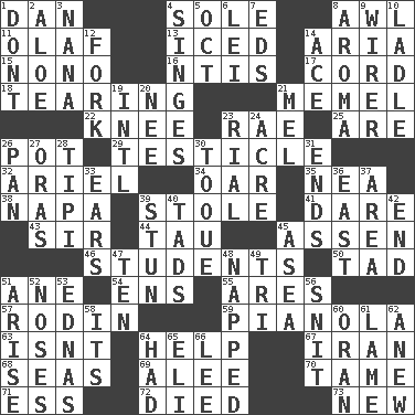 ACROSS 1. One of the 12 tribes of Israel 4. Not divided or shared with others 8. Leather borer 11. Norwegian king 13. On the rocks 14. Roberta Peters solo 15. Words to Nanette 16. Nuclear Threat Initiatives 17. Drawstring 18. Separating forcefully 21. Klaipeda city 22. Leg joint 23. Actress Charlotte 25. "We ___ not amused" (Victoria) 26. Plant holder 29. A testis 32. Satellite of Uranus 34. Boat paddle 35. Teachers' org. 38. California wine valley 39. Took without asking 41. Have the gumption 43. Title for a knight 44. The 19th letter of the Greek alphabet 45. NE Netherlands city 46. SAT takers 50. Small boy 51. One (Scot) 54. Followers of ems 55. Ancient Greek god of war 57. "The Thinker" sculptor 59. Player piano 63. Is not 64. Assist 67. SW Asia republic 68. Oceans 69. Toward shelter 70. Docile 71. Double-curved letter 72. Passed on 73. ___ Haven, CT DOWN 1. Do not 2. _ vera 3. Grandmother 4. Scorches 5. Sep. follower 6. Flowery wreath 7. Begley and Asner 8. Scent 9. One who wires 10. Dipping utensil 12. Tined utensil 14. Adept person 19. International (abbr.) 20. Born 21. Cartoonist voice _ Blanc 23. Monetary unit of Yemen 24. 43,560 square feet 26. Baking dish 27. Mouths or openings 28. Native american tent (variation) 30. Woman's close-fitting hat 31. Extremities 33. Hearing organs 36. 90 degrees 37. Length times width 39. Surprise greatly 40. Small amounts or degrees 42. Conclusion 45. At sea 47. "___ Little Indians" 48. Slept 49. Three (prefix) 51. Ascend 52. Olfactory organs 53. Ferber et al. 56. In a ____ (agitated or irritated) 58. It is 60. Northwest Algerian city 61. Unable to walk 62. Afresh 64. Possessed 65. Connecticut Ivy Leaguer 66. Area sheltered from the wind