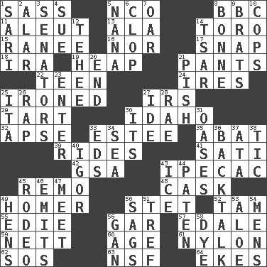 ACROSS 1. Backtalk 5. Non-commissioned officer (abbr.) 8. English channel? 11. Native American of Southwest Alaska 13. Wing 14. "Corrida" creature 15. The wife of a rajah (variant) 16. Not either 17. Fastener 18. Lyricist Gershwin 19. Pile 21. Leg coverings 22. Adolescent 24. Angers 25. Pressed 27. Big collection agency 29. Small pie 30. Potato state 32. Domed church section 33. First name in cosmetics 35. Blind as ____ 39. Amusement-park features 41. Suttee (variant) 42. Girls' org. (abbr.) 43. Medicinal drug used to evoke vomiting 45. San ____ (Riviera town) 48. Keg 49. Home run 50. Proofreading order 52. Scottish cap 55. Singer Brickell 56. Slender fish 57. Peak District village in England 59. Remaining after all deductions 60. Mature 61. High-strength synthetic material 62. Mayday 63. Science/research agcy. 64. Makes supply last DOWN 1. Indian skirt 2. Having or resembling wings 3. Legislators 4. Institute legal proceedings 5. Grandmother 6. Hoof sound 7. Rowing implement 8. Maid-servant 9. Naughty children 10. 911 reaches them 12. Giggle 14. Russian ruler of old 20. Conclusion 21. Expression of disdain 23. Keyboard key 25. Call ___ day 26. Strike 27. Binary compound 28. Actress Charlotte 30. It is 31. Fertile tracts in a desert 33. Begley and Asner 34. Ocean 36. Sass 37. "One Day ___ Time" 38. Nervous spasm 40. Composer Stravinsky 43. Frozen water 44. Eucharist need 45. Cowboy competition 46. Gives off 47. Confront 49. Coop moms 50. Droops 51. Not kosher 53. _ vera 54. Not women's 56. Separate the seeds from cotton 58. Color
