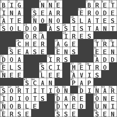 ACROSS 1. Of large size 4. Compass dir. 7. Cy Young winner Saberhagen 11. _ tizzy (2 wds.) 12. Dry up 13. Eat (away) 14. Had dinner 15. Words to Nanette 16. Chalkboards 17. Twentieth part of a lira 19. Aide 21. Mouth or opening 23. Angers 24. "Mermaids" star 25. Ripen 26. Three (prefix) 29. Gospel singer Marvin 30. Followers of ems 31. Car or cant ending 32. ___ good deed 33. Big collection agency 34. Increase 35. Raised railways 36. _-fi 37. Paris' subway 40. Born 41. Area sheltered from the wind 42. Deliberation 43. Skim 45. Infant food 46. Drawing lots 51. Middle Eastern gold or silver currency 55. Foolish or stupid persons 56. Have the gumption 58. Single 59. Impressive in appearance 60. Colored 61. Corn or form start 62. Celtic language 63. Compass dir. 64. Elected rep. DOWN 1. Prejudice 2. To the inside or interior of 3. Highlander 4. Modern: prefix 5. Grandmother 6. Greek god of love 7. Naughty children 8. Round or rotation of duties 9. Locale of original sin 10. Trial 12. Sounds asleep 13. Otherwise 16. Titles for men of rank and authority 18. Capital of the state of Qatar 20. Signals 22. "We ___ not amused" (Victoria) 24. Stop 25. Nest on high 26. Lacerates 27. Redecorate 28. Working for oneself (abbr.) 29. Not divided or shared with others 32. Lair 33. Ancient Celtic tribe of eastern Britain 36. Narrow boards 37. Atlas unit 38. Dodged 39. Native american tent (variation) 43. Fur scarf 44. Quote 46. Trig term 47. Aroma 48. Teases 49. Likelihood 50. Negative votes 52. Common sense 53. Singer Murray 54. It's straight from the horse's mouth 57. To separate or throw off
