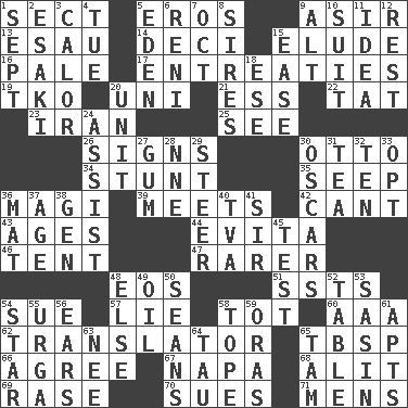 ACROSS 1. Religious group 5. Greek god of love 9. SW Saudi Arabia district 13. Son of Isaac 14. Tenth: prefix 15. Dodge 16. Light colored 17. Pleas 19. Ring climax 20. University (slang) 21. Double-curved letter 22. Make lace 23. SW Asia republic 25. Perceive with the eye 26. Omens 30. Von Bismarck 34. Difficult or unusual or dangerous feat 35. Ooze 36. Wise men 39. Confronts 42. Patter 43. Matures 44. Webber/Rice musical 46. Portable shelter 47. Less widely known 48. Greek goddess of the dawn 51. Fast planes 54. Institute legal proceedings 57. Whopper 58. Small child 60. American Automobile Association (abbr.) 62. Interpreter 65. Cook's measure (abbr.) 66. Match 67. California wine valley 68. Set down 69. To erase 70. Institutes legal proceedings 71. Not women's DOWN 1. Back-to-school mo. 2. 1973 Nobel Price Winner (Physics) Leo 3. Bodily heat indicating an inflammation 4. Third day of the wk. 5. Paradise 6. Painter Guido (1575-1642) 7. Sep. follower 8. Fathers 9. Keyboard modifier key 10. Set of matching outer garments 11. The main thing one is thinking about 12. Repose 15. Relaxation 18. Compass dir. 20. A single undivided whole 24. Aid 27. Chewing product 28. Compass dir. 29. Bull 30. Motion picture awards 31. Afternoon social gathering 32. "___ Little Indians" 33. Elect 36. Floor covering 37. Mature 38. Commissioned mil. rank 40. Federal power corp. 41. Title for a knight 45. Trial 48. Otherwise 49. Lubricate 50. Actors Connery and Penn 52. Eating place 53. Indian antelope 54. Play the lead 55. Capital and largest city of Mongolia 56. Hearing organs 58. Drink excessively 59. Mouths or openings 61. Tenement units (abbr.) 63. Born 64. The 19th letter of the Greek alphabet 65. Scottish cap