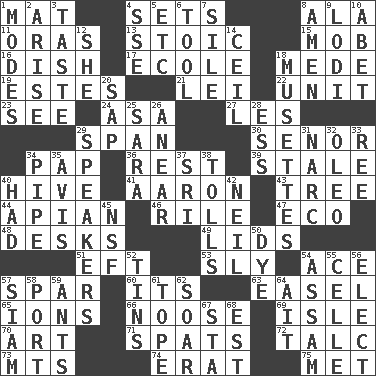 ACROSS 1. Floor protector 4. Arranges properly for use 8. According to 11. Mouths or openings 13. Unemotional 15. Disorderly crowd 16. Food container 17. Learning spot: Fr. 18. Ancient Persian 19. _____ Park, CO 21. Luau accessory 22. A single undivided whole 23. Observe 24. White ___ sheet 27. French article 29. Connect, as a bridge 30. Sir (Sp.) 34. Infant food 36. Relief 39. Lacking originality or spontaneity 40. Hub of activity 41. Composer Copland 43. Woody plant 44. Bee-related 46. Cause heat under the collar 47. Environmental prefix 48. Writing tables 49. Hats (slang) 51. Bank Draft (abbr.) 53. Roguish 54. Adept person 57. Practice fight 60. ___ a Wonderful Life 63. Artist's stand 65. Charged particles 66. Trap for birds or small mammals 69. Small island 70. Nonscientific branch of learning 71. Arguments over trivial matters 72. Baby powder 73. Mountains (abbr.) 74. Part of Q.E.F. 75. Was introduced to DOWN 1. Methods 2. Originate 3. Clothes sense 4. Compass dir. 5. And so on (abbr.) 6. Utensil 7. Drop; flow; fall 8. So be it 9. Farming town in central California 10. Collude with 12. A female animal or person 14. To provide with a ceiling 18. French bagpipes 20. Plant excrement 25. "Two Mules for Sister ____" 26. Approach 28. Curvy letter 29. Orators 31. Drug cop 32. Margarine 33. To riddle 34. Corncob 35. Deliberation 37. _ Lanka 38. For Whom the Bell _____ 40. Possessed 42. Famous astronaut Armstrong 45. Overdraft (abbr.) 50. Color 52. Airtight sealed metal containers 54. Indian state 55. Cell (Danish) 56. Voters do this 57. Thailand, formerly 58. Sweet dark-red dessert wine 59. Pismires 61. Drink excessively 62. Fly high 64. Small island 67. R.R. building 68. Eastern Standard Time (abbr.)