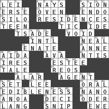 ACROSS 1. Flowery wreath 4. Negative votes 8. The Jewish people; Israel 12. Celtic language 14. Baking chamber 15. Inside; within (prefix) 16. Grain storage tower 17. Homes 20. Adolescent 21. Nervous spasm 22. Binary compound 23. Sadhe (variant) 27. Nothingness 29. International (abbr.) 31. Anneal 34. Related on the mother's side 35. Singer Murray 36. Opera by Verdi 39. Actress Gardner 41. Nuclear Threat Initiatives 42. Angers 43. First name in cosmetics 46. Story 47. Vintage cars 48. Having or resembling wings 51. Rep 54. Put into a specified state 56. Area sheltered from the wind 58. Of the mouth 61. The property of being fit to eat 66. Billionth: prefix 67. Small Philippine buffalo 68. Tenth: prefix 69. River in Europe 70. Austrian-born American filmmaker Fritz 71. Clip 72. She-sheep DOWN 1. For fear that 2. One of the Great Lakes 3. Small island 4. And not 5. "___ Maria" 6. It is so 7. In a ____ (agitated or irritated) 8. Elected rep. 9. Event 10. Wrote a lyric poem 11. Sense of smell 13. Immeasurably long periods of time 18. HTML Container Element 19. Environmental prefix 24. The 18th letter of the Arabic alphabet 25. Heredity factor (abbr.) 26. Singer James 28. Silly 30. Crowbar 32. Black tropical American cuckoo 33. French article 34. Artist's stand 36. Small island 37. Lyricist Gershwin 38. Accusation by an informer 40. Toward the sea 44. Coat; cloak 45. Compass dir. 49. 100% 50. To riddle 52. Words to Nanette 53. Exchange 54. Lick closed 55. Pulitzer Prize-winning author Ferber 57. Extremities 59. Afresh 60. Old wives' tales, e.g. 62. Container for groceries 63. Car or cant ending 64. _-fi 65. Small drink