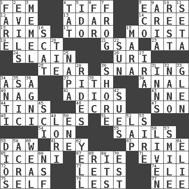 ACROSS 1. Opposite of masc. 4. Small quarrel 8. Hearing organs 12. "___ Maria" 13. The sixth month of the Jewish calendar 14. Algonquian 15. Basketball hoops 17. "Corrida" creature 18. Damp 19. Voters do this 21. Girls' org. (abbr.) 23. _ moment's notice (2 wds.) 24. Killed 26. RI univ. 28. Lacerate 30. Catching in a trap 34. White ___ sheet 37. Essential or central part 39. Of or related to the anus 40. Tired old horse 41. Goodbye (Sp.) 43. Compass dir. 44. Metal containers 46. Shade of tan 47. Manchild 48. Winter's stalactites 51. Snakelike fish 54. Electrically charged atom 55. Travel by water 58. Fool 61. Marina Del _, California 63. First class 65. Ancient Celtic tribe of eastern Britain 67. One of the Great Lakes 71. Morally bad or wrong 72. Mouths or openings 73. Allows 74. Biblical high priest 75. Itself 76. For fear that 77. Born DOWN 1. Conductor's collection 2. Vices 3. Klaipeda city 4. Make lace 5. Wedding promise 6. At a great distance 7. Tree-dwelling hopper 8. Environmental prefix 9. Operatic vocal solo 10. Respite 11. Stalk of a moss capsule 16. Go away! 18. Hindu Mythology: god of death 20. Neckwear 22. Player for Phoenix 25. California wine valley 27. Lyricist Gershwin 29. Amusement-park features 30. Dinah or Pauly 31. Taverns 32. Billionth: prefix 33. Small, secluded valley 34. Against 35. Ketch in the Levant 36. Hindu god of fire 38. Nervous spasm 42. Takes to court 45. _-fi 49. Australian parrot (variant) 50. Compass dir. 52. Infant locale 53. Father 56. Make or become more lively 57. Grin 58. "Vaya con ____" 59. Land measure 60. Welt 62. Shout 64. Writer Wiesel 66. Overdraft (abbr.) 68. To riddle 69. It is 70. Eastern Standard Time (abbr.)