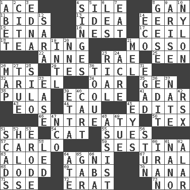 ACROSS 1. Adept person 4. Filth; sediment 8. Separate the seeds from cotton 11. Auction offers 13. It may be bright or harebrained 14. Suggestive of the supernatural 15. Inactive volcano in Sicily 16. Egg locale 17. To provide with a ceiling 18. Rending 21. With motion or animation 22. Queen of England 1702-14 23. Actress Charlotte 25. Car or cant ending 26. Mountains (abbr.) 29. A testis 32. Satellite of Uranus 34. Rowing implement 35. Commissioned mil. rank 38. Monetary unit of Botswana 39. Learning spot: Fr. 41. The sixth month of the Jewish calendar 43. Greek goddess of the dawn 44. The 19th letter of the Greek alphabet 45. Proofreads 46. Plea 50. John Ritter's dad 51. A female animal or person 54. Domesticated feline 55. Institutes legal proceedings 57. Monte _, Las Vegas Hotel/Casino 59. French poetic form 63. Medicinal plant 64. Hindu god of fire 67. Mountain range 68. Texas town _ City 69. Bar bills 70. Nanny 71. Compass dir. 72. Part of Q.E.F. 73. And not DOWN 1. Collude with 2. Quote 3. Pulitzer Prize-winning author Ferber 4. Burns superficially 5. Binary compound 6. French article 7. Consume 8. Honkers 9. Ascend 10. Thermoplastic polyamide 12. "Two Mules for Sister ____" 14. Environmental prefix 19. International (abbr.) 20. Compass dir. 21. Cartoonist voice _ Blanc 23. Monetary unit of Yemen 24. 1/640 square mile 26. Atlas unit 27. Loyal 28. Grain storage tower 30. Woman's close-fitting hat 31. Mild oath 33. Relaxation 36. Prepare for publication 37. Nathan's nickname 39. Singer James 40. Haul 42. Acura sports coupe 45. Sight organs 47. Non-commissioned officer (abbr.) 48. Help 49. Third day of the wk. 51. Tons 52. Rings 53. Eat (away) 56. Surprise greatly 58. Directed 60. SW Asia republic 61. Billionth: prefix 62. Having or resembling wings 64. Had dinner 65. Slender fish 66. Basketball assoc.