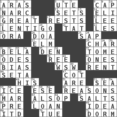 ACROSS 1. Ancient river in northeast Turkey 5. Shoshoni 8. Head covering 11. Drug cop 12. Puts into a specified state 14. Connecticut Ivy Leaguer 15. Relatively large 17. Musical pauses 18. Area sheltered from the wind 19. Small, flat, pigmented spot on the skin 21. Make lace 22. French article 23. Mouth or opening 24. ___ good deed 25. Plant excrement 27. Shade tree 28. Burn to charcoal 31. Actor Lugosi 35. Lair 37. Heavy book 38. Lyric poems 39. To separate or throw off 41. Washington bills 42. Prejudice 43. Compass dir. 45. Monthly bill 46. Bristle 47. Small bed 49. Part of HMS, perhaps 51. "We ___ not amused" (Victoria) 52. Ocean 55. Frozen water 57. Compass dir. 60. Thinks logically 62. Make imperfect 63. Columnist Joseph or Stewart 65. Table seasonings 66. Before (prefix) 67. Grant temporary use of 68. The content of cognition 69. It would 70. Third day of the wk. 71. Dormintory (informal) DOWN 1. White American of non-Hispanic descent 2. More uncommon 3. Sports stadium 4. Leave at once 5. Purpose 6. Trial 7. Singer James 8. Portable communications device 9. Toward shelter 10. Sliced desserts 13. Fast planes 16. Event that recurs at intervals 17. Wanderer 20. Gilded 26. Thespian 29. So be it 30. Relief 31. Moves up and down 32. Singer Brickell 33. Resembling or made to resemble leather 34. Slender Brazilian palm 36. ___ Haven, CT 40. Fortification 44. Had on 48. Afternoon social gatherings 50. Lick closed 52. Twentieth part of a lira 53. Keyboard key 54. Indian state 55. Body of Kaffir warriors 56. Heavy open wagon 58. Narrow, elongated depression 59. Son of Isaac 61. Alleged 64. Single