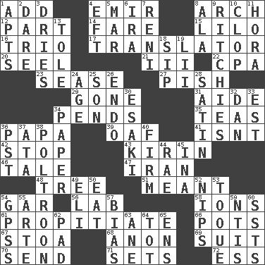 ACROSS 1. Increase 4. Arab leader 8. Bowlike part 12. Role in a play 14. Conductor's collection 15. _ and Stitch 16. Musical group of three 17. Interpreter 20. Sew up the eyelids of hawks and falcons 21. One more than two 22. Tax preparer (abbr.) 23. Gospel singer Marvin 27. Expression of disdain 29. Went 31. Assistant 34. Depends 35. Afternoon social gatherings 36. Dad 39. Clumsy lout 41. Is not 42. Halt 43. Japanese brewing company 46. Lie 47. SW Asia republic 48. Woody plant 51. Intended 54. Slender fish 56. Experiment locale 58. Charged particles 61. Appease 66. Cooking vessels 67. Portico 68. Soon (poet.) 69. Costume for a special activity 70. Post 71. Arranges properly for use 72. Curvy letter DOWN 1. Tenement units (abbr.) 2. Have the gumption 3. Frees from moisture 4. Bank Draft (abbr.) 5. Impair 6. Retirement account (abbr.) 7. Painter Guido (1575-1642) 8. Insect wing 9. Actors Guy, Robert Welles, and Clint 10. Hoof sound 11. Israeli folk dance 13. Lacquered or enameled metalware 18. Small drink 19. Cards in a Roman deck? 24. Personal question 25. Male child 26. Inside; within (prefix) 28. Smooth fabric 30. 1973 Nobel Price Winner (Physics) Leo 32. One of the 12 tribes of Israel 33. Eastern Standard Time (abbr.) 34. Some stationery 36. Pacific Standard Time (abbr.) 37. "One Day ___ Time" 38. Coward 40. Unshakable 44. Actress Charlotte 45. _ tizzy (2 wds.) 49. Connecticut Ivy Leaguer 50. Consume 52. Cuts off 53. Woman's close-fitting hat 54. Global Positioning Systems (abbr.) 55. Johnson of "Laugh-In" 57. Prejudice 59. Nuclear Threat Initiatives 60. Fast planes 62. Writing tablet 63. One (Scot) 64. Small child 65. Followers of ems