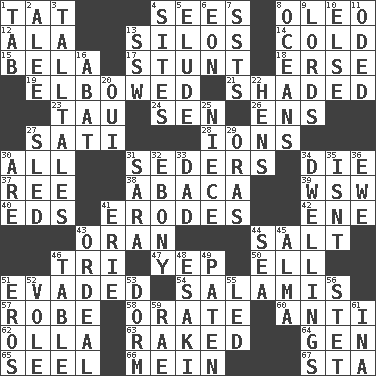 ACROSS 1. Make lace 4. Observes 8. Margarine 12. According to 13. Grain storage towers 14. Chilled 15. Actor Lugosi 17. Check the growth or development of 18. Celtic language 19. Turned at an angle; bent 21. Cast a shadow over 23. The 19th letter of the Greek alphabet 24. Elected rep. 26. Followers of ems 27. Suttee (variant) 28. Charged particles 30. Everything 31. Spring feasts 34. Expire 37. To separate or throw off 38. Phillipine bananalike plant 39. Compass dir. 40. Begley and Asner 41. Eats (away) 42. Compass dir. 43. NW Algerian seaport 44. Table seasoning 46. Three (prefix) 47. Slangy assent 50. Pipe bend 51. Eluded 54. Deli grouping 57. Loose flowing garment 58. Declaim 60. Against 62. Rounded earthenware pot or jar 63. Swept the length of 64. Commissioned military rank (abbr.) 65. Sew up the eyelids of hawks and falcons 66. Count _ (2 wds.) 67. R.R. building DOWN 1. Keyboard key 2. Toward shelter 3. Baron Munchausen's specialties 4. Locates 5. Dodge 6. A really long time 7. Fast planes 8. Seas 9. Nobles 10. Otherwise 11. Wrote a lyric poem 13. Compass dir. 16. Blind as ____ 20. Fr. "Yes" 22. Coop moms 25. Sibling's daughter 27. Downhill vehicle 29. Mouths or openings 30. "We ___ not amused" (Victoria) 31. "Two Mules for Sister ____" 32. Black 33. June honoree 34. Homes 35. Is not 36. She-sheep 41. 4th largest of the Great Lakes 43. Severe or trying experience 44. Ocean 45. _ mater 46. Eating place 48. 1973 Nobel Price Winner (Physics) Leo 49. Eucharist need 51. Greek god of love 52. Grand slam 53. Dormintory (informal) 55. Directed 56. Proofreading order 59. Actress Charlotte 61. _ tizzy (2 wds.)