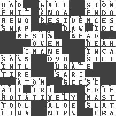 ACROSS 1. Possessed 4. Highlander 8. The Jewish people; Israel 12. Give off 14. Small Philippine buffalo 15. Inside; within (prefix) 16. Former U.S. Attorney General Janet 17. Dwellings 20. Fastener 21. Simpleton 22. Binary compound 23. Musical pauses 27. Necklace unit 29. Baking chamber 31. 480, 500 or 516 sheets of paper 34. Empty; void 35. South American Indian 36. Backtalk 39. Movie disc 41. Proofreading order 42. International (abbr.) 43. A salt of uric acid 46. Hoop that covers a wheel 47. Indian skirt 48. Tiny particle 51. Honkers 54. Keyboard modifier key 56. Three (prefix) 58. Singer Brickell 61. Rotating or pertaining to rotation 66. Political cartoonist Thomas 67. Utensil 68. _ vera 69. Narrow board 70. Inactive volcano in Sicily 71. Pinches, bites 72. Period DOWN 1. Possessive pronoun 2. So be it 3. Middle Eastern gold or silver currency 4. Slender fish 5. One (Scot) 6. Greek goddess of the dawn 7. Put down 8. Elected rep. 9. Happening 10. Wrote a lyric poem 11. Sense of smell 13. Drink excessively 18. Small moist lump or mass 19. She-sheep 24. Boy, to dad 25. Federal power corp. 26. Transmit 28. Ascend 30. Congenital growth or mark on the skin 32. Adept person 33. Floor covering 34. Small island 36. Be seated 37. Cuckoo 38. Ski resort town in Vermont 40. To be drawn or hauled along 44. "We ___ not amused" (Victoria) 45. Neckwear 49. Baseball player Mel 50. Medical imaging device (abbr.) 52. Elected reps. 53. Peak District village in England 54. Johnson of "Laugh-In" 55. Plunder 57. _ the terrible 59. Austrian river, tributary to the Danube 60. Singer James 62. In the manner of 63. Biblical high priest 64. Trim (branches) 65. Affirmative reply