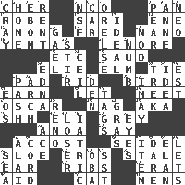 ACROSS 1. "Mermaids" star 5. Non-commissioned officer (abbr.) 8. Baking dish 11. Loose flowing garment 12. Indian skirt 14. Compass dir. 15. Amid 17. Flintstone 18. Billionth: prefix 19. Gossips 21. Poe poem 23. And so on (abbr.) 25. Saudi Arabian king (1953-1964) 26. Writer Wiesel 27. Shade tree 28. Neckwear 31. Groovy apt. 33. To free from 35. Avian creatures 37. Merit 38. Allow 40. Confront 41. Motion picture award 43. Tired old horse 45. Alias (abbr.) 46. Quiet! 47. Biblical high priest 50. Jennifer or Joel 52. Small Philippine buffalo 53. Declare 54. Buttonhole 56. A glass for beer 61. _ gin 62. Greek god of love 65. Showing deterioration from age 66. Ewer handle 67. Teases 68. Part of Q.E.F. 69. Assist 70. Feline 71. Not women's DOWN 1. Supercomputer manufacturer 2. Dwelling 3. Inky black, to poets 4. Monthly bill 5. Science/research agcy. 6. 4-wheeled motor vehicle 7. Threatening words 8. Lightbulb-shaped fruit 9. Queen of England 1702-14 10. Modern: prefix 13. Perfect 16. Highlander 18. Dreamland 20. Commotion 22. Unfeeling 24. To provide with a ceiling 26. Pulitzer Prize-winning author Ferber 28. Long journey 29. It may be bright or harebrained 30. Eastern Standard Time (abbr.) 31. Romantic infatuation 32. Bowlike part 34. Lair 36. "If ____ say so..." 37. Greek goddess of the dawn 39. Labels 42. Western Nevada city 44. Pate de foie ____ 48. Failure 49. Of or pertaining to medicine 51. Sight organs 52. Adept person 54. Jai _ 55. Drawstring 57. A whole individual unit 58. Have the gumption 59. Liveliness 60. Allows 61. Ocean 63. Chief or king in Benin or Nigeria 64. Fast jet (abbr.)