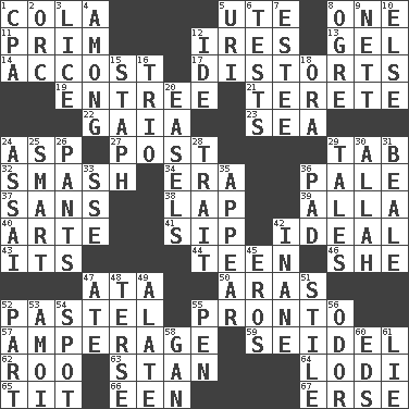 ACROSS 1. Root beer relative 5. Shoshoni 8. Single 11. Demure 12. Angers 13. Set 14. Buttonhole 17. What propaganda does 19. Main course 21. Cigar-shaped 22. Greek goddess of the earth (variant) 23. Ocean 24. Viper 27. Mail 29. Bar bill 32. Box-office sellout 34. Period 36. Light colored 37. Without 38. Infant locale 39. Silent film actress Nazimova 40. Johnson of "Laugh-In" 41. Small drink 42. Standard of perfection 43. ___ a Wonderful Life 44. Adolescent 46. A female animal or person 47. _ moment's notice (2 wds.) 50. Ancient river in northeast Turkey 52. Soft color 55. Right away 57. Electrical Measurement 59. A glass for beer 62. Friend of Pooh 63. Comedian Laurel of Laurel & Hardy 64. Farming town in central California 65. Teat (slang) 66. Car or cant ending 67. Celtic language DOWN 1. Numbers guy (abbr.) 2. The grampus (Milton) 3. Louse (plural) 4. Amid 5. RI univ. 6. Trials 7. First name in cosmetics 8. Legendary monster 9. Remaining after all deductions 10. Otherwise 12. Binary compound 15. Staphylococcus 16. Musical group of three 18. Mouth or opening 20. Artist's stands 24. Slender Brazilian palm 25. Don Adams' spy role 26. Leg coverings 28. Distinguishing feature 29. Lies 30. Assad's deity 31. Calif. Air Force Base 33. Compass dir. 35. Become visible 36. Writing tablet 42. Lacking in sense or substance 45. Greek god of love 47. Had dinner 48. Laconic 49. Having winglike extensions 51. Vertical member of a panel or frame 52. Piece 53. Mine, in Marseilles 54. Specific locale 55. Writing instrument 56. Aroma 58. Separate the seeds from cotton 60. Begley and Asner 61. Falsehood