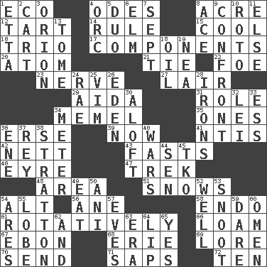 ACROSS 1. Environmental prefix 4. Lyric poems 8. Measure of real estate 12. Small pie 14. General guideline 15. Calm and collected 16. Musical group of three 17. Parts 20. Smallest unit of an element 21. Neckwear 22. Enemy 23. Impudent aggressiveness 27. Den 29. Opera by Verdi 31. Hero or heavy, e.g. 34. Klaipeda city 35. Washington bills 36. Celtic language 39. Immediately 41. Nuclear Threat Initiatives 42. Remaining after all deductions 43. Goes without food and/or water 46. Jane of fiction 47. Long journey 48. Type of rug 51. Overwhelms 54. Keyboard modifier key 56. A saturated hydrocarbon 58. Inside; within (prefix) 61. Producing rotation 66. Rich soil 67. Inky black, to poets 68. 4th largest of the Great Lakes 69. Old wives' tales, e.g. 70. Transmit 71. Plant excrements 72. "___ Little Indians" DOWN 1. Singer James 2. Heavy open wagon 3. Constellation of myth 4. The grampus (Milton) 5. Superhero pair 6. Shade tree 7. Back-to-school mo. 8. Adept person 9. Meet 10. Printing process, for short 11. Otherwise 13. Heavy book 18. Petroleum 19. Teachers' org. 24. Actress Charlotte 25. Zeal 26. Genesis locale 28. Removes the wrinkles 30. High up in or into the air 32. Flowery wreath 33. Curvy letter 34. Distance measurement 36. Compass dir. 37. Marina Del _, California 38. Ski resort town in Vermont 40. Armed conflicts 44. Elected rep. 45. Ring climax 49. Erode 50. Black tropical American cuckoo 52. Not ill 53. Snob 54. Ancient Greek god of war 55. Ear part 57. Nights before holidays 59. Have the gumption 60. Presage 62. Added to 63. Period 64. Mouth edge 65. Affirmative reply