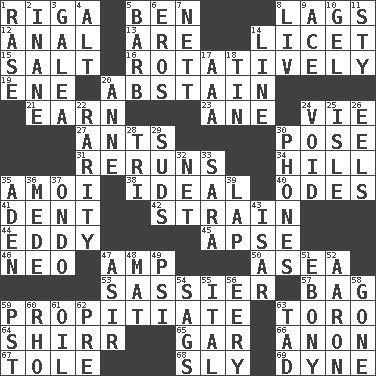 ACROSS 1. Port city in Latvia 5. Benjamin's nick name 8. Fails to keep up a pace 12. Of or related to the anus 13. "We ___ not amused" (Victoria) 14. It is permitted: Lat. 15. Table seasoning 16. Rotating or pertaining to rotation 19. Compass dir. 20. Refrain by choice 21. Merit 23. A saturated hydrocarbon 24. Compete 27. Pismires 30. Airs 31. Summer TV shows 34. Land elevation 35. Mine, in Marseilles 38. Standard of perfection 40. Lyric poems 41. Incision 42. Put through a sieve 44. Whirlpool 45. Domed church section 46. Modern: prefix 47. Electrical Unit 50. At sea 53. More disrespectful 57. Container for groceries 59. Appease 63. "Corrida" creature 64. Bake eggs in their shells 65. Slender fish 66. At once, immediately (arch.) 67. Lacquered or enameled metalware 68. Mischievous 69. Centimeter-gram-second unit of force DOWN 1. To erase 2. Empty; void 3. An organ shaped like a helmet 4. The first octave above the treble staff 5. Sharp remark 6. Greek god of love 7. Remaining after all deductions 8. 54 in ancient Rome 9. Adept person 10. Set 11. Filthy place 14. Actor's bit 17. American Automobile Association (abbr.) 18. Shallow baking pan 20. Singer Murray 22. Noteworthy scarcity 24. Null 25. Capri or Wight 26. Snakelike fish 28. Three (prefix) 29. Soap bubbles 30. Gives a jingle 32. Fish or hair follower 33. "Two Mules for Sister ____" 35. Arabian gulf 36. Ancient Persian 37. Southwest Nigerian state 39. Infant locale 43. Austrian river, tributary to the Danube 47. SW Saudi Arabia district 48. Floor protector 49. Air pressure measure (abbr.) 51. Dark wood 52. Composer Copland 54. Settles 55. Slanted text style (abbr.) 56. Suggestive of the supernatural 58. Went 59. Pacific Standard Time (abbr.) 60. 17th letter of the Greek alphabet 61. Petroleum 62. Before (prefix) 63. Small boy