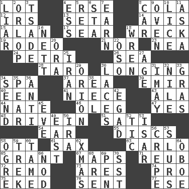 ACROSS 1. Car dealer's back yard 4. Celtic language 8. Root beer relative 12. Big collection agency 13. Stalk of a moss capsule 14. Deliberation 15. ____ Jay Lerner 17. Scorch 18. Raze 19. Cowboy competition 21. Or not 23. Teachers' org. 24. _ dish (used to culture cells) 26. Ocean 28. Edible starchy tuberous root 30. Yearning 34. Health resort 37. Length times width 39. Arab leader 40. Car or cant ending 41. Sibling's daughter 43. Wing 44. Nathan's nickname 46. Cassini of fashion 47. Consenting reply 48. Popular '50s hangout 51. Suttee (variant) 54. Ewer handle 55. Flat circles 58. Baseball player Mel 61. Saxophone 63. Monte _, Las Vegas Hotel/Casino 65. Let have 67. Atlas contents 71. Reuben's nickname 72. San ____ (Riviera town) 73. Ancient Greek god of war 74. Adept person 75. Made supply last 76. Transmitted 77. Compass dir. DOWN 1. One who doesn't tell the truth 2. Fourth or lowest deck 3. Sadhe (variant) 4. Double-curved letter 5. Portuguese money of account (variant) 6. R.R. building 7. Merit 8. Automobile 9. Baking chamber 10. Louse (plural) 11. "____ silly question..." 16. Remaining after all deductions 18. Songbird 20. Mouth or opening 22. Bear (Spanish) 25. SW Asia republic 27. Ripen 29. Constellation of myth 30. Shoestrings 31. "If ____ say so..." 32. The longest river in the world 33. Pate de foie ____ 34. Post 35. Lightbulb-shaped fruit 36. Opposed to 38. Snakelike fish 42. Mild oath 45. First lady 49. Compass direction 50. Lyricist Gershwin 52. Nervous spasm 53. Austrian river, tributary to the Danube 56. Streamer paper 57. Disparaging remarks 58. Legendary monster 59. Long journey 60. Docile 62. Dec. holiday 64. Mitch Miller's instrument 66. Lower and raise head in agreement 68. "We ___ not amused" (Victoria) 69. Writing instrument 70. Fast jet (abbr.)