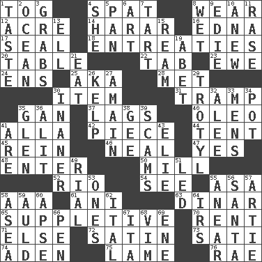 ACROSS 1. Coat; cloak 4. Argument over a trivial matter 8. Erode 12. 1/640 square mile 14. Ethiopian city, capital of Harari 16. Pulitzer Prize-winning author Ferber 17. Lick closed 18. Pleas 20. Eating place 22. Keyboard key 23. She-sheep 24. Followers of ems 25. Alias (abbr.) 28. Was introduced to 30. A whole individual unit 31. _____ steamer (cargo ship) 35. Separate the seeds from cotton 37. Fails to keep up a pace 40. Butter sub 41. Silent film actress Nazimova 42. Part 44. Portable shelter 45. It's straight from the horse's mouth 46. Anneal 47. It is so 48. Keyboard key 50. Place where flour is made 52. River (Sp.) 54. Observe 55. White ___ sheet 58. American Automobile Association (abbr.) 61. Cuckoo 63. Middle Eastern gold or silver currency 65. Supplying deficiencies 70. Monthly bill 71. Otherwise 72. Smooth fabric 73. Suttee (variant) 74. Arabian gulf 75. Unable to walk 76. Actress Charlotte DOWN 1. Clothes sense 2. Sea 3. Catches 4. A female animal or person 5. Baking dish 6. Nonscientific branch of learning 7. Small pie 8. Soggy 9. Singer Brickell 10. Afresh 11. Raze (variant) 13. Pipe bend 15. 480, 500 or 516 sheets of paper 19. Collude with 21. Ingest 26. Seaweed 27. At full speed 29. Trinitrotoluene 30. Sillier 32. Toward shelter 33. Not women's 34. Plant holder 35. Small, secluded valley 36. Set down 38. Unit of force equal to gravity 39. Fraudulent business schemes 41. "We ___ not amused" (Victoria) 43. Writer Wiesel 49. Monetary unit of Yemen 51. Directed 53. Singles 55. Approach 56. Before Barbara or Clara 57. Nick name for Arthur 58. Toward the sea 59. Old (Scot.) 60. Domed church section 62. Slanted text style (abbr.) 64. Big collection agency 66. Animal enclosure 67. Call ___ day 68. Zeal 69. Compass dir.