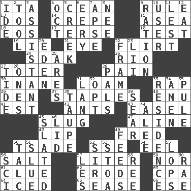 ACROSS 1. Call ___ day 4. Sea 9. Court order 13. Two (Sp.) 14. Streamer paper 15. Toward the sea 16. Greek goddess of the dawn 17. Laconic 18. Trial 19. Whopper 21. Sight organ 22. Seductive woman who exploits men 24. Neighbor of Neb. 26. _ de Janeiro 27. Carrier 29. Ache 30. Silly 31. Rich soil 33. Strike 36. Lair 37. Paper fasteners 40. Australian flightless bird 41. Eastern Standard Time (abbr.) 42. Pismires 43. Artist's stand 45. A hard, heavy blow 47. Place in a line 48. Mouth edge 49. Flintstone 50. Sadhe (variant) 52. Compass dir. 54. Snakelike fish 56. Table seasoning 57. 61 cubic inches 59. And not 61. A slight indication 62. Eat (away) 63. Tax preparer (abbr.) 64. On the rocks 65. Gospel singer Marvin 66. Compass dir. DOWN 1. Binary compound 2. Implement 3. Aide 4. Sep. follower 5. Small stream 6. Suggestive of the supernatural 7. Domed church section 8. Born 9. Food allowance for one day 10. One who uses or employs something 11. For fear that 12. Consume 20. Paradise 22. Movie unit 23. Cards in a Roman deck? 25. Ancient Greek god of war 27. Periodic rise and fall of the sea level 28. Singles 29. Friends 31. Austrian-born American filmmaker Fritz 32. Choose 33. Dwelling 34. So be it 35. Whine 38. Grayish beige 39. Dry up 44. Toward shelter 45. Scheduled 46. Hat (slang) 49. Eats 50. Baby powder 51. Turn sharply 52. Beget 53. Portico 55. Chops off 56. _-fi 57. French article 58. To separate or throw off 60. Actress Charlotte