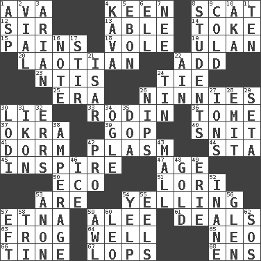 ACROSS 1. Actress Gardner 4. Peachy ____! 8. Scram, to a cat 12. Title for a knight 13. Competent 14. Casino tip 15. Aches 18. Grand slam 19. ____ Bator 20. Of or relating to Laos or its people 22. Increase 23. Nuclear Threat Initiatives 24. Make a knot 25. Epoch 26. Fools 30. Untruth 33. "The Thinker" sculptor 36. Heavy book 37. Gumbo ingredient 39. Grand Old Party 40. In a ____ (agitated or irritated) 41. Dormintory (informal) 42. Suffix with ecto or cyto 44. R.R. building 45. Motivate 47. Grow older 50. Environmental prefix 51. Australian parrot (variant) 53. "We ___ not amused" (Victoria) 54. Crying or shouting loudly 57. Inactive volcano in Sicily 59. Toward shelter 61. Allots cards 63. Toadlike animal 64. Not ill 65. Modern: prefix 66. Prong on a fork 67. Chops off 68. Followers of ems DOWN 1. Viper 2. Small bottle 3. Believer in; advocate of (suffix) 4. Polynesian shrub of the pepper family 5. Inky black, to poets 6. Pipe bend 7. Born 8. SAT takers 9. Lacking warmth 10. Alias (abbr.) 11. "___ Little Indians" 16. Make mention of 17. Commotion 21. Austrian river, tributary to the Danube 22. The 18th letter of the Arabic alphabet 24. Shallow baking pan 26. Cuts off 27. Charged atoms 28. Give off 29. Stalk of a moss capsule 30. Farming town in central California 31. Visual representation of an object 32. Blunders 34. Stare at amorously 35. ___ good deed 38. Electrical Measurement 42. Adept person 43. Promenade 46. Frozen water 48. Aureate 49. One of the Great Lakes 52. Silly 53. Soon (poet.) 54. Sharp bark 55. Snakelike fish 56. Small, secluded valley 57. Bank Draft (abbr.) 58. Three (prefix) 59. Leather borer 60. Lion 62. Distress signal
