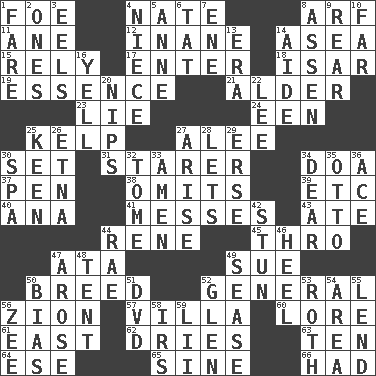 ACROSS 1. Enemy 4. Nathan's nickname 8. Sandy's bark 11. One (Scot) 12. Silly 14. At sea 15. Trust 17. Keyboard key 18. Austrian river, tributary to the Danube 19. Gist 21. Tree or shrub in the Birch family 23. Falsehood 24. Car or cant ending 25. Seaweed 27. Toward shelter 30. Arrange properly for use 31. A viewer who gazes fixedly 34. ___ good deed 37. Writing instrument 38. Leaves out 39. And so on (abbr.) 40. Santa ___, CA 41. Makes clutter 43. Had dinner 44. French philosopher Descartes 45. Through, poetically 47. "One Day ___ Time" 49. Institute legal proceedings 50. A special lineage 52. Commissioned military rank 56. The Jewish people; Israel 57. Country estate 60. Old wives' tales, e.g. 61. Compass direction 62. Frees from moisture 63. "___ Little Indians" 64. Compass dir. 65. Trig term 66. Possessed DOWN 1. Conductor's collection 2. Washington bills 3. Snakelike fish 4. Sibling's daughter 5. Queen of England 1702-14 6. Make lace 7. Compass dir. 8. NE Netherlands city 9. Hitchcock's "____ Window" 10. Distant 13. Period 14. Assistant 16. Shout 20. Cuts off 22. Area sheltered from the wind 25. Peachy ____! 26. Inactive volcano in Sicily 27. Get up 28. Allows 29. Celtic language 30. Health resort 32. Heavy book 33. So be it 34. Letter starter 35. Von Bismarck 36. Adept person 42. Make senseless or dizzy 44. Actress Charlotte 46. The bottom of a shoe or boot 47. Came up 48. Portable shelter 49. Gospel singer Marvin 50. Prejudice 51. Movie disc 52. Small, secluded valley 53. Writer of Portnoy's Complaint (1969) 54. Type of rug 55. Grant temporary use of 56. Last letter of the English alphabet 58. Big collection agency 59. Cards in a Roman deck?