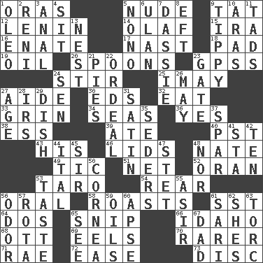 ACROSS 1. Mouths or openings 5. Unadorned 9. Make lace 12. Soviet premier 1918-24 14. Norwegian king 15. Retirement account (abbr.) 16. Related on the mother's side 17. Political cartoonist Thomas 18. Groovy apt. 19. Lubricate 20. Soup utensils 23. Global Positioning Systems (abbr.) 24. Agitate 25. "If ____ say so..." 27. Helper 30. Begley and Asner 32. Ingest 33. Smile widely 34. Oceans 36. Consenting reply 38. Curvy letter 39. Had dinner 40. Pacific Standard Time (abbr.) 43. Part of HMS, perhaps 46. Hats (slang) 48. Nathan's nickname 49. Nervous spasm 51. Fish or hair follower 52. NW Algerian seaport 53. Pacific island yam 54. Located in or toward the back 56. Of the mouth 58. Exposes to great heat 61. Fast jet (abbr.) 64. Two (Sp.) 65. Clip 66. Potato state 68. Baseball player Mel 69. Snakelike fish 70. More valued for its uncommonness 71. Actress Charlotte 72. Comfort 73. Flat circle DOWN 1. Butter sub 2. Painter Guido (1575-1642) 3. Of or related to the anus 4. Be seated 5. Words to Nanette 6. ____ Bator 7. Hyrax 8. Bank Draft (abbr.) 9. Likely to tip or tilt 10. Caspian sea tributary 11. Small amounts or degrees 13. A home for chicks 21. Sliced desserts 22. Severe or trying experience 23. Yard entry 24. Elected rep. 26. Can I? 27. Mature 28. Big collection agency 29. Food container 31. Smooth fabric 35. Spring feasts 37. Practice fight 41. R.R. building 42. "___ Little Indians" 44. Slanted text style (abbr.) 45. Title for a knight 47. Proofreading order 48. Not either 50. Pupil covering 53. Clothes sense 55. SW Saudi Arabia district 56. Aroma 57. Roll call or roster of names 59. Petroleums 60. Domed church section 61. Indian skirt 62. "______ My Girl" (Turtles hit) 63. Torque (variant) 65. Perceive with the eye 67. Male parent