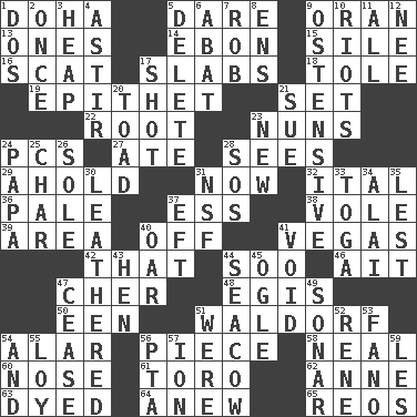 ACROSS 1. Capital of the state of Qatar 5. Have the gumption 9. Northwest Algerian city 13. Singles 14. Inky black, to poets 15. Filth; sediment 16. Leave at once 17. Broad, flat, thick pieces 18. Lacquered or enameled metalware 19. Curse 21. Put into a specified state 22. Carrot, for example 23. Religious women 24. Personal Computers (abbr.) 27. Had dinner 28. Observes 29. Hold, grip (Informal) 31. Immediately 32. Slanted text style (abbr.) 36. Diluted with white 37. Curvy letter 38. Grand slam 39. Type of rug 40. Below a satisfactory level 41. Viva Las _ 42. Not this but _ 44. "Barney Miller" actor Jack 46. Small island 47. "Mermaids" star 48. Armor plate that protects the chest 50. Car or cant ending 51. Apple salad 54. Having or resembling wings 56. Component 58. Be tempered by heat 60. Characteristic smell of wine 61. "Corrida" creature 62. Queen of England 1702-14 63. Colored 64. Afresh 65. Vintage cars DOWN 1. Two (Sp.) 2. Single time 3. Pile 4. Having gotten out of bed 5. Keyboard key 6. Blind as ____ 7. Director Reiner 8. Followers of ems 9. Clearly or manifestly demonstrative 10. Debaucheries 11. Everything 12. Born 17. Attempt 20. Frog relative 21. Take to court 23. ___ Haven, CT 24. Dad 25. Burn to charcoal 26. Flatfish 28. Mayday 30. Tough but pliablecoriaceous 31. Overdraft (abbr.) 33. Ancient Roman robe 34. Jai ____ 35. For fear that 37. Lizard (obsolete) 40. Boat paddle 41. Empty area or space 43. Layer 44. Manatee 45. Stare 47. Stop 49. Underwater navigation system 51. Past tense of be (plural) 52. French philosopher Descartes 53. Papal veil 54. Also 55. Myrna of the movies 56. Parent Teacher Association (abbr.) 57. Electrically charged atom 59. French article