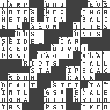 ACROSS 1. Canvas cover 5. RI univ. 8. Greek goddess of the dawn 11. Off-Broadway awards 13. Modern: prefix 14. Engineer (abbr.) 15. Distance measurement (Brit.) 16. Metal container 17. Indonesian resort city 18. And so on (abbr.) 19. Period of immesurable duration 21. Lugs 22. Flexible conduit 24. Singles 25. A glass for beer 27. Rowing implement 29. On the rocks 30. A piece of turf (Scot.) 32. Airs 33. White Person, in Hawaii 35. Blind as ____ 39. Debaucheries 41. Shopping center 42. R.R. building 43. Medicinal drug used to evoke vomiting 45. Within a short period 48. Keg 49. Started a card game 50. Proofreading order 52. Make lace 55. International (abbr.) 56. Girls' org. (abbr.) 57. Peak District village in England 59. Capital of the state of Qatar 60. Baseball player Mel 61. High-strength synthetic material 62. Big collection agency 63. 23rd letter of the Greek alphabet 64. Supplemented with great effort DOWN 1. Heavy book 2. Collude with 3. Actors Guy, Robert Welles, and Clint 4. For each 5. To (old English) 6. It's straight from the horse's mouth 7. Electrically charged atom 8. Maternal 9. Stares 10. Indian titles of respect 12. Gospel singer Marvin 14. Inky black, to poets 20. Snakelike fish 21. "Corrida" creature 23. More peculiar 25. Small drink 26. Environmental prefix 27. Petroleum 28. "___ Maria" 30. Two (Sp.) 31. Makes less strong or intense 33. Being at a high temperature 34. _ moment's notice (2 wds.) 36. Sass 37. In the manner of 38. Affectionate concern, for short 40. Is not 43. Frozen water 44. Eucharist need 45. Sir (Sp.) 46. Curses 47. Spanish pot 49. "You Light Up My Life" star Conn 50. Fast planes 51. Jacques of French films 53. _ vera 54. Look after 56. Grand Old Party 58. Color